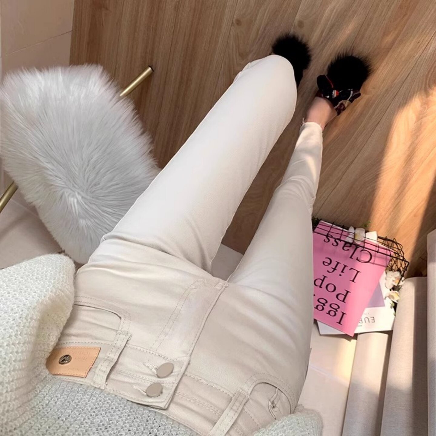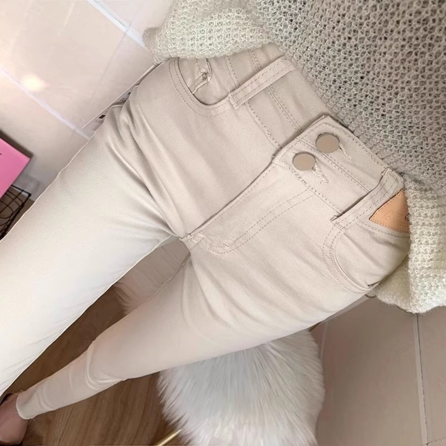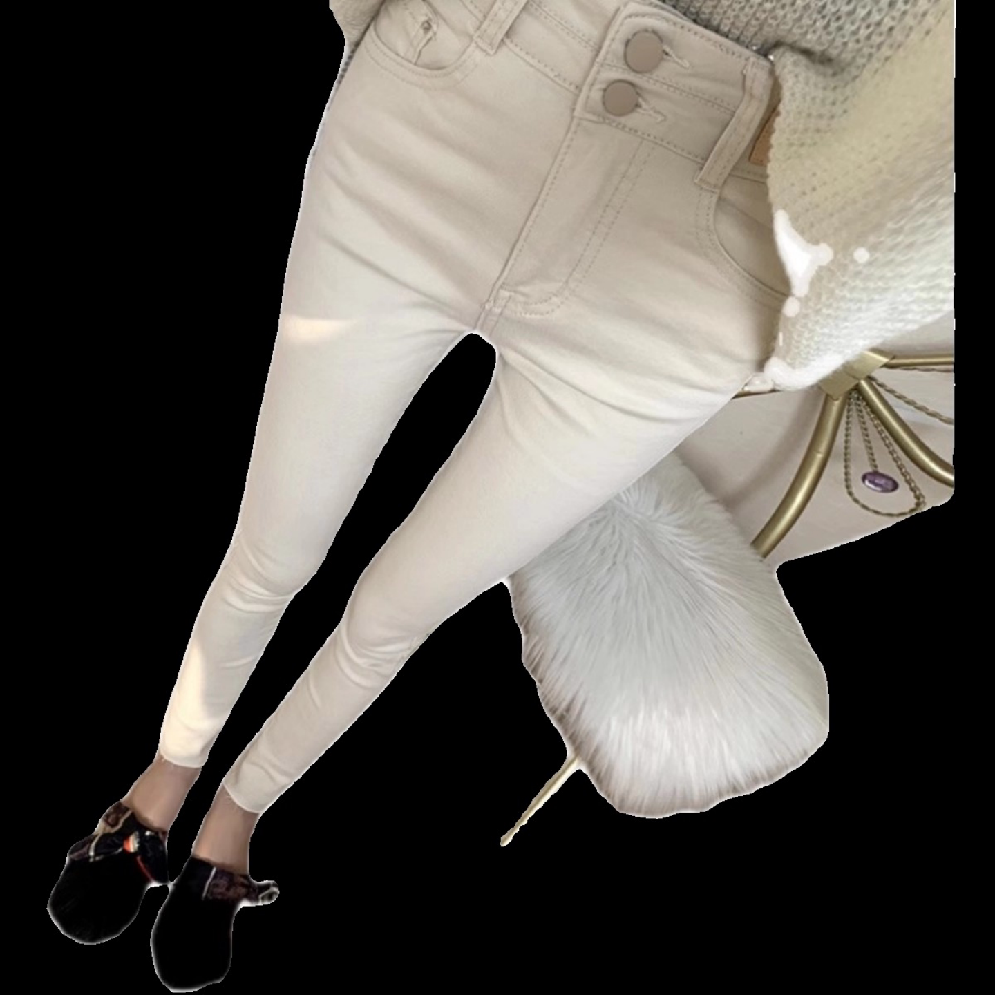📚 显瘦必入!米白色高腰收腹牛仔裤女弹力修身九分小脚裤子2025秋冬