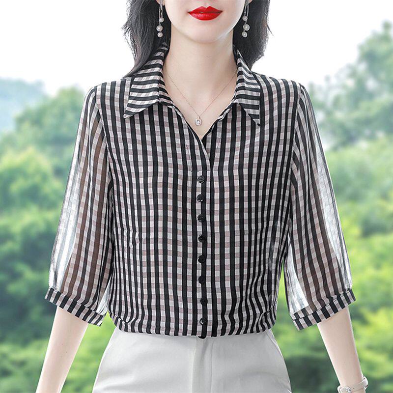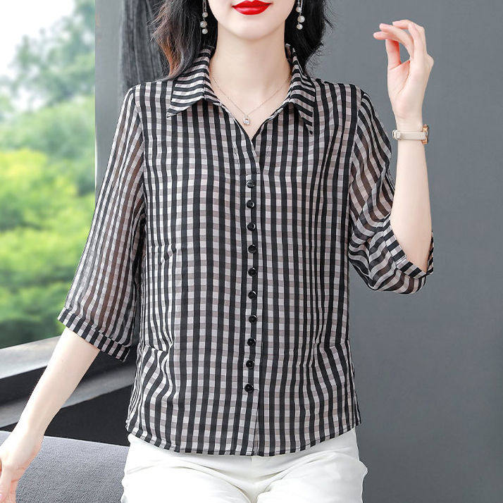 📚 时髦七分袖格子衬衫夏装新款韩版妈妈减龄宽松遮肚雪纺衫洋气小衫