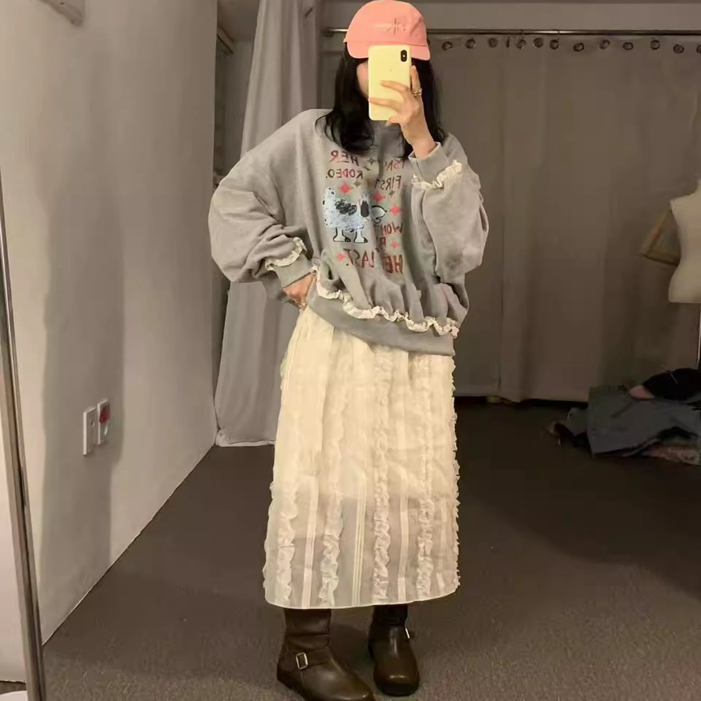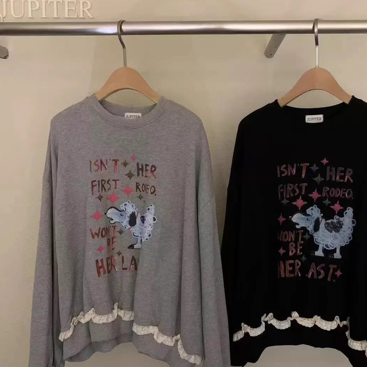 📚 现韩国东大门代购女JUPITER2025秋百搭宽松卡通印花花边套头卫衣
