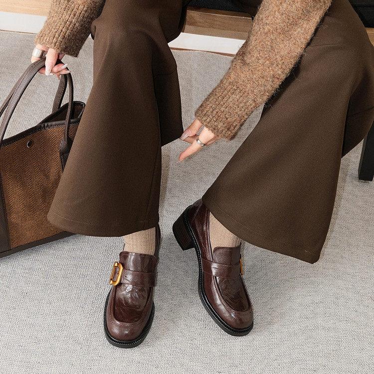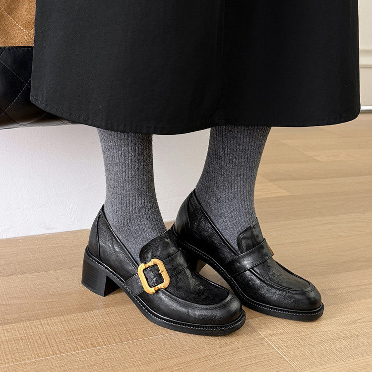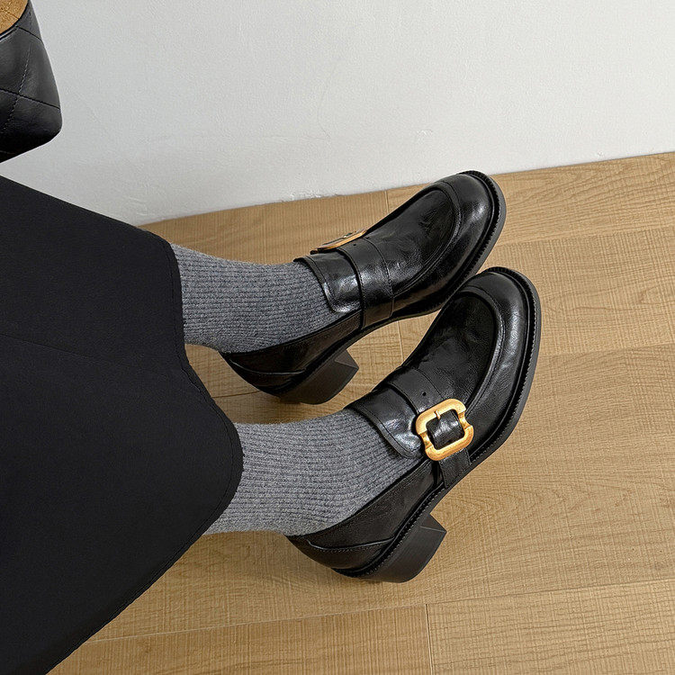 📚 5.5cm英伦粗跟金属扣一脚蹬乐福鞋女2026新款方扣单鞋百搭小皮鞋