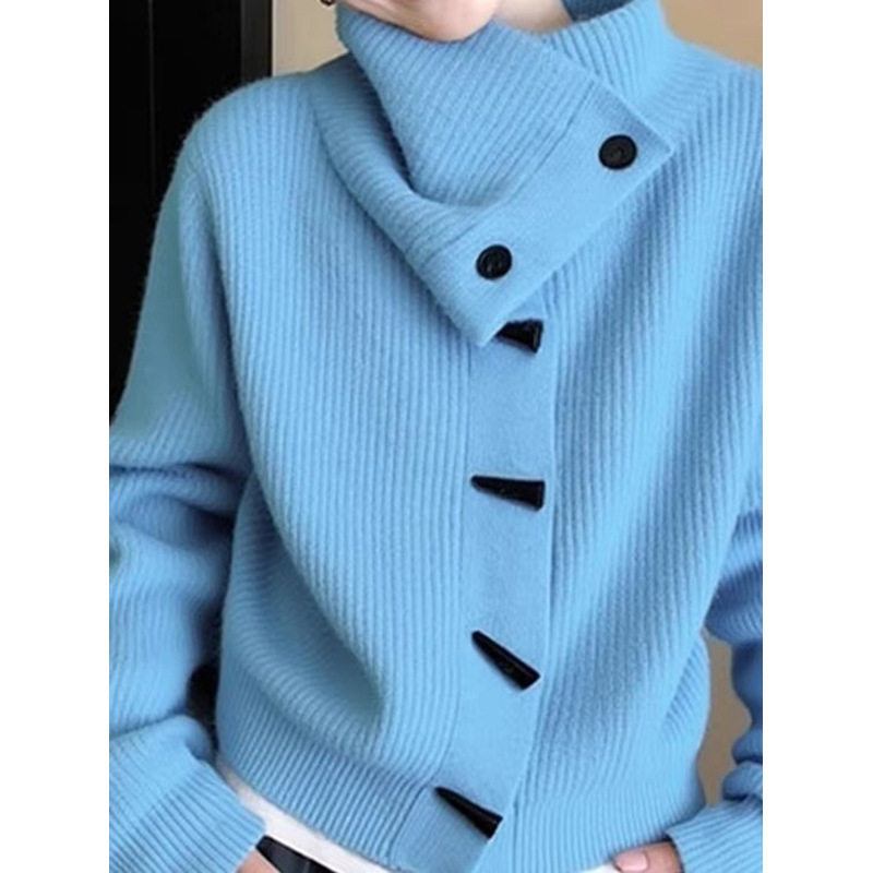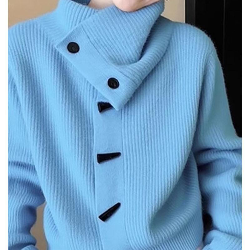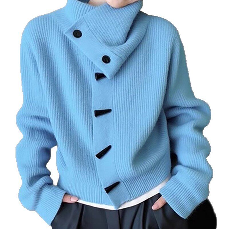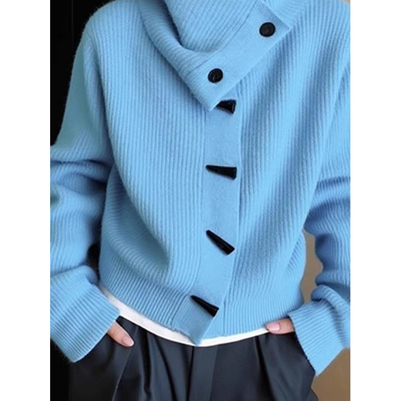 📚 不撞款蓝色高领毛衣女牛角扣坑条针织开衫女