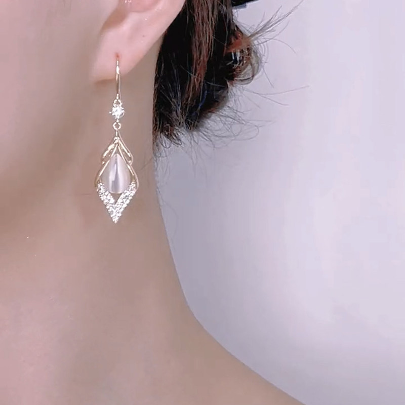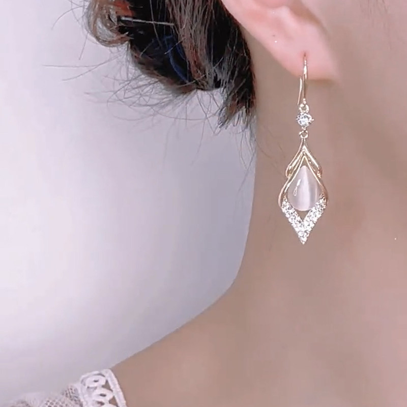 📚 几何菱形猫眼石耳环高级感显贵气时尚耳饰长款气质水滴女神耳坠潮