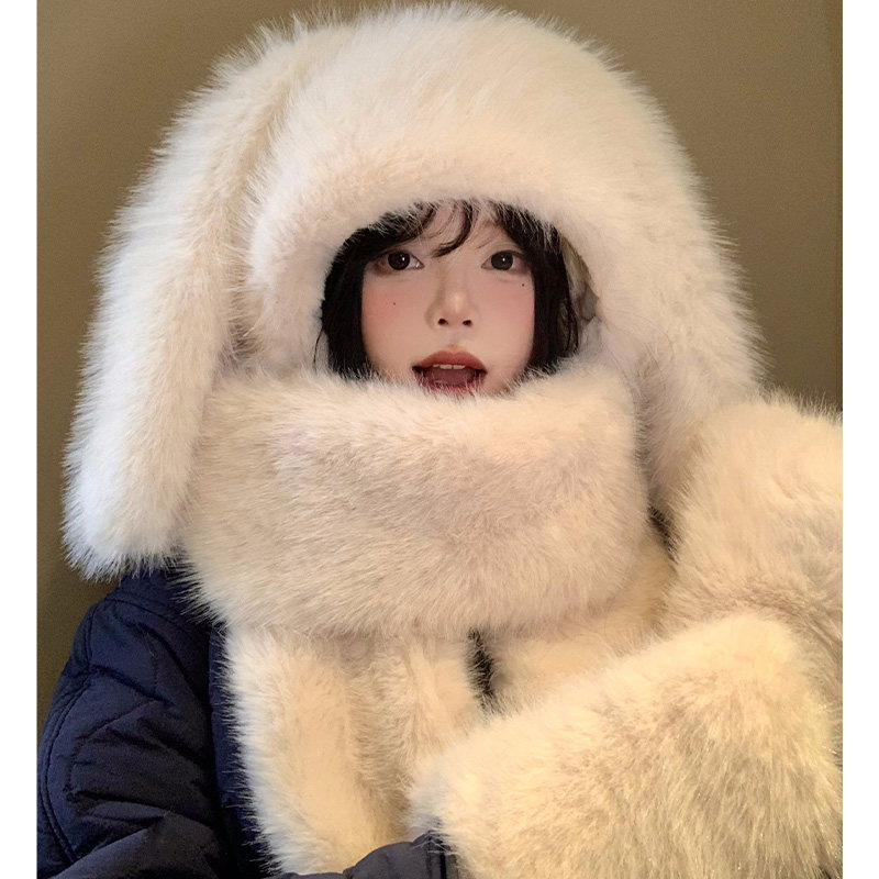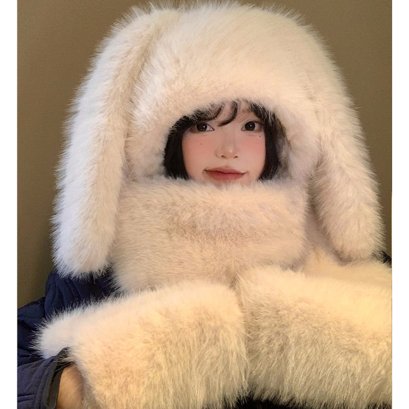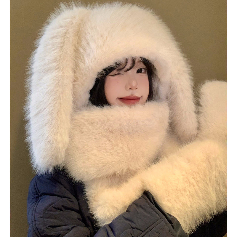 📚 可爱兔子耳朵帽子围巾一体女秋冬季保暖护耳毛绒帽防寒手套三件套