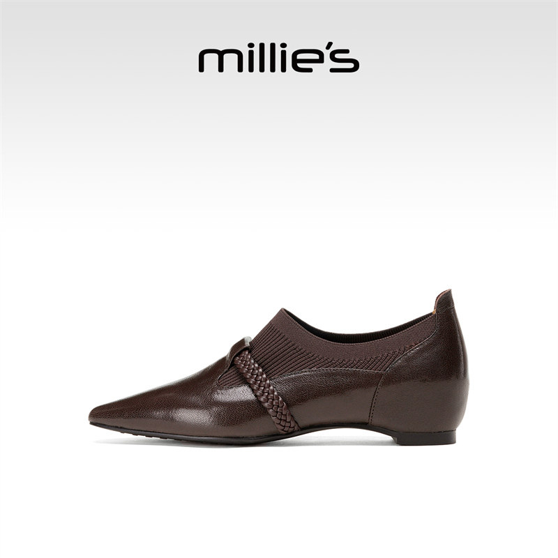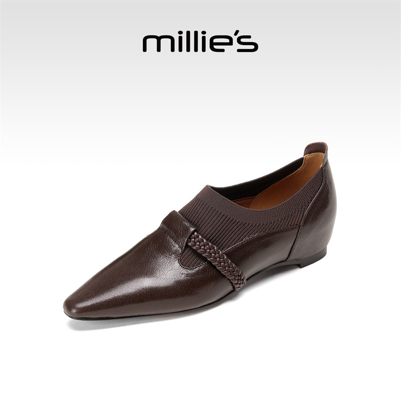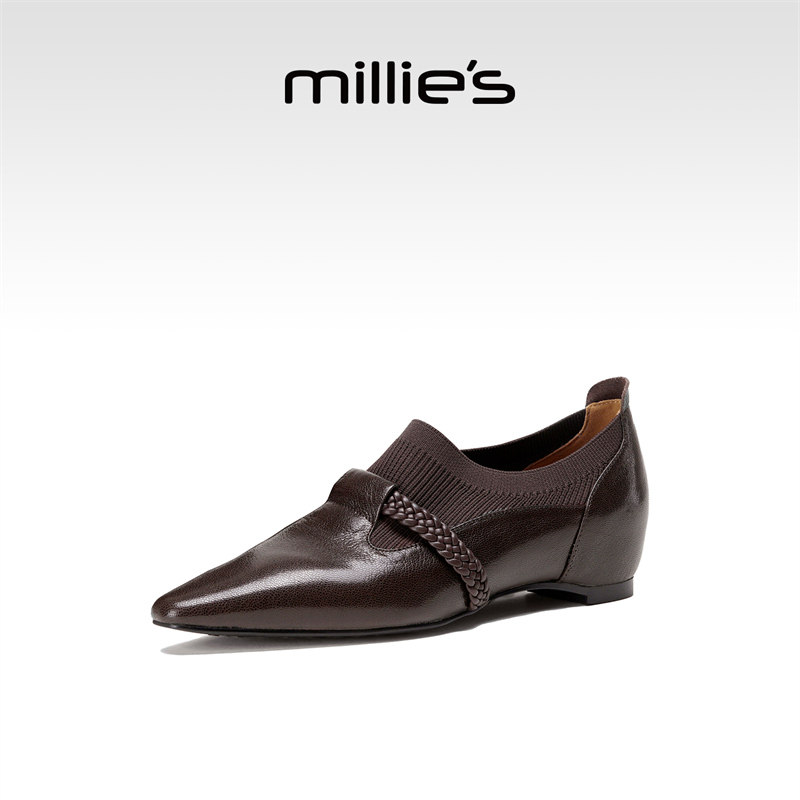 📚 MILLIE'S/妙丽真皮内增高尖头法式单鞋新款袜口编织一脚蹬小皮鞋