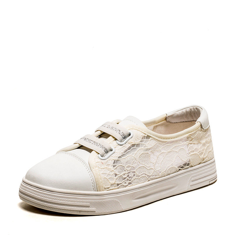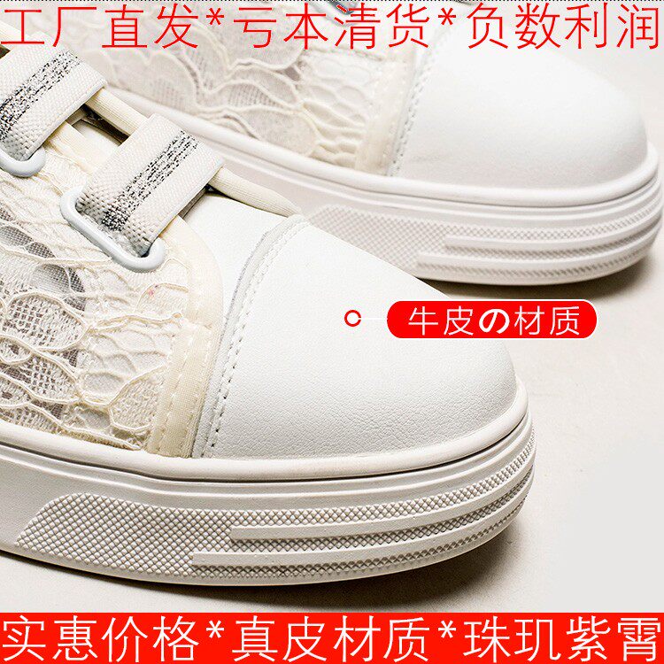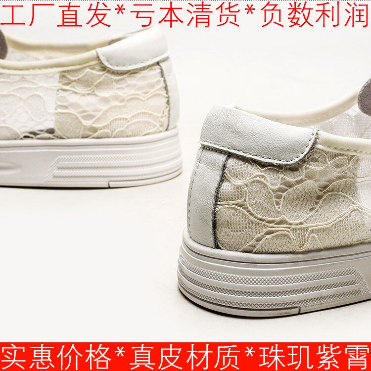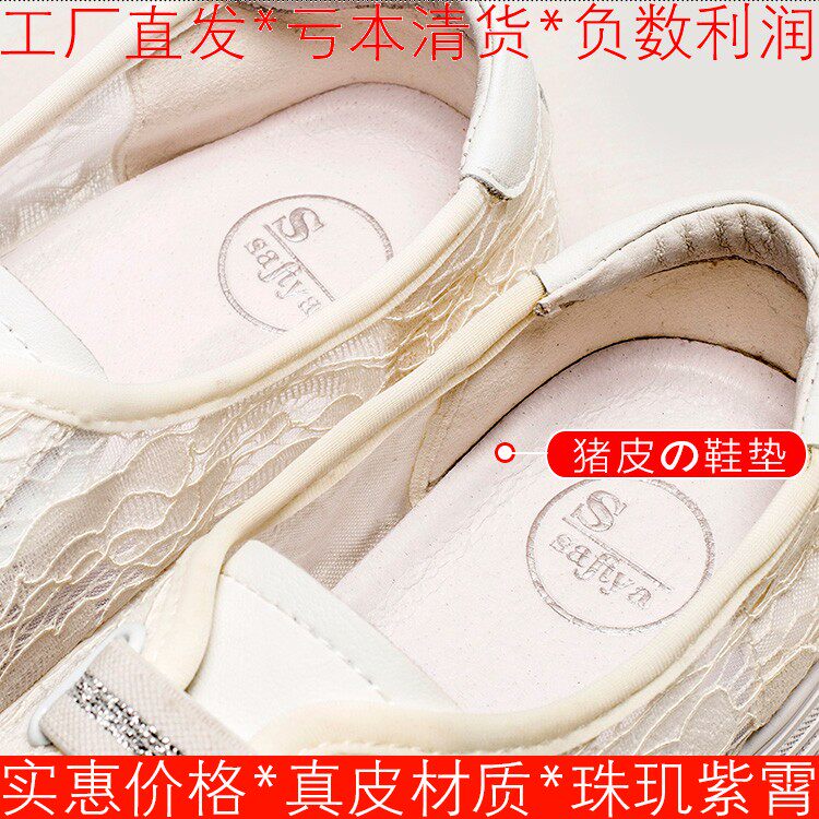 📚 真皮板鞋白色牛皮拼接网纱蕾丝休闲鞋子女圆头平跟厚底SF21112399