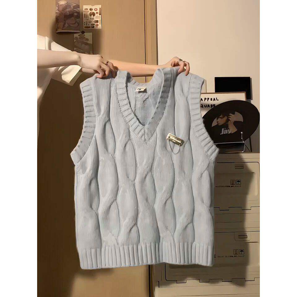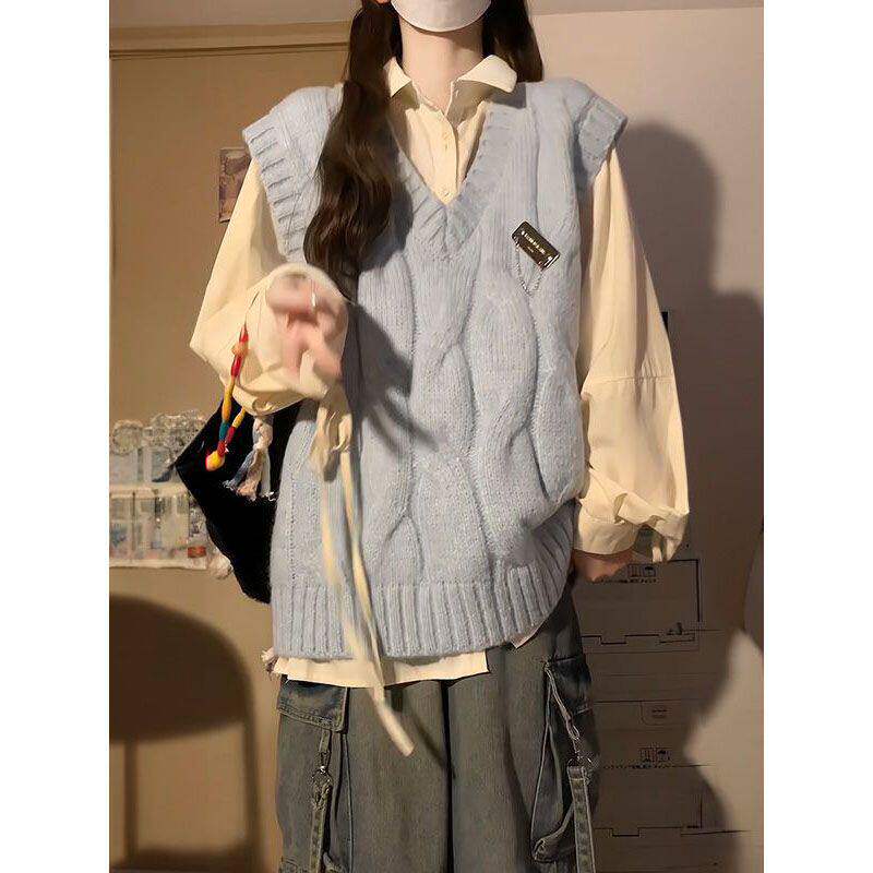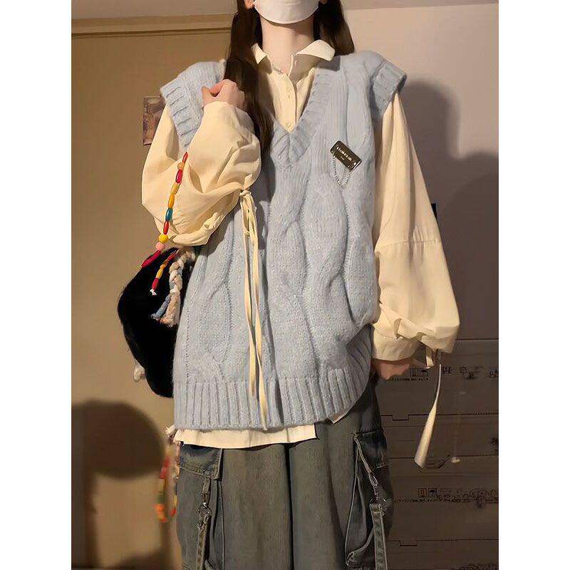📚 单件套装秋季日系甜美蓝色麻花针织马甲背心毛衣女杏色绑带衬衫