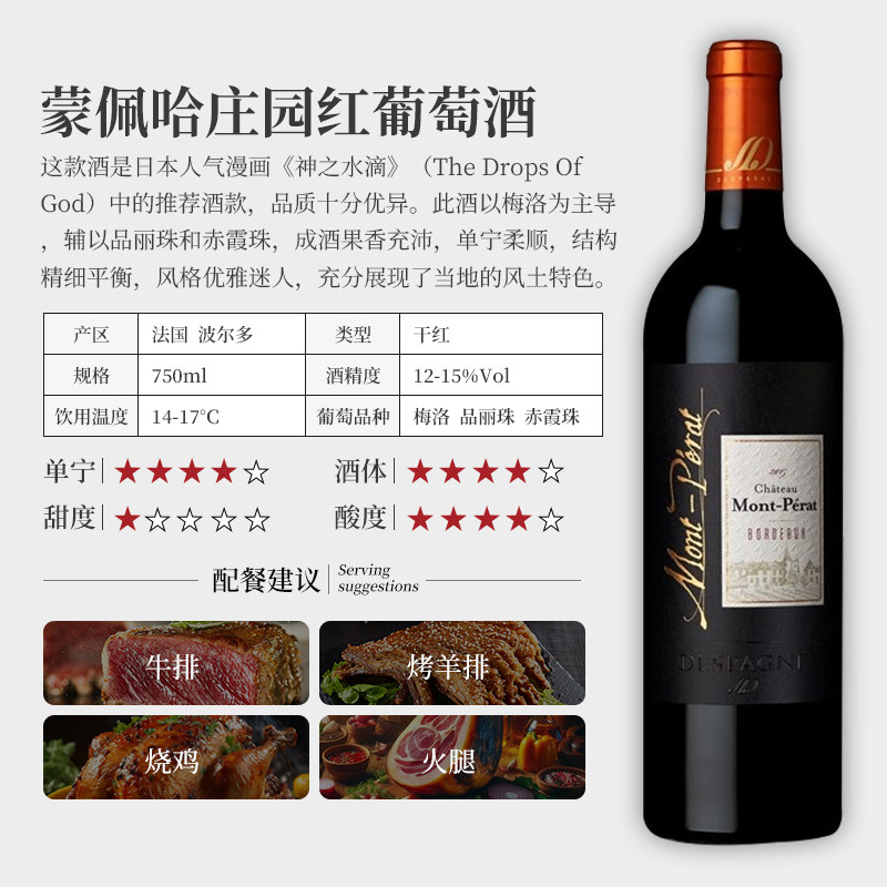 📚 骏德 【神之水滴推荐】蒙佩哈庄园法国波尔多干红葡萄酒750ml送礼