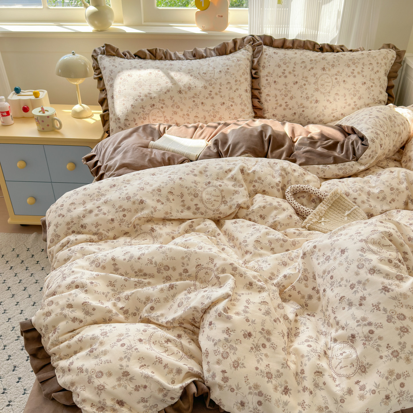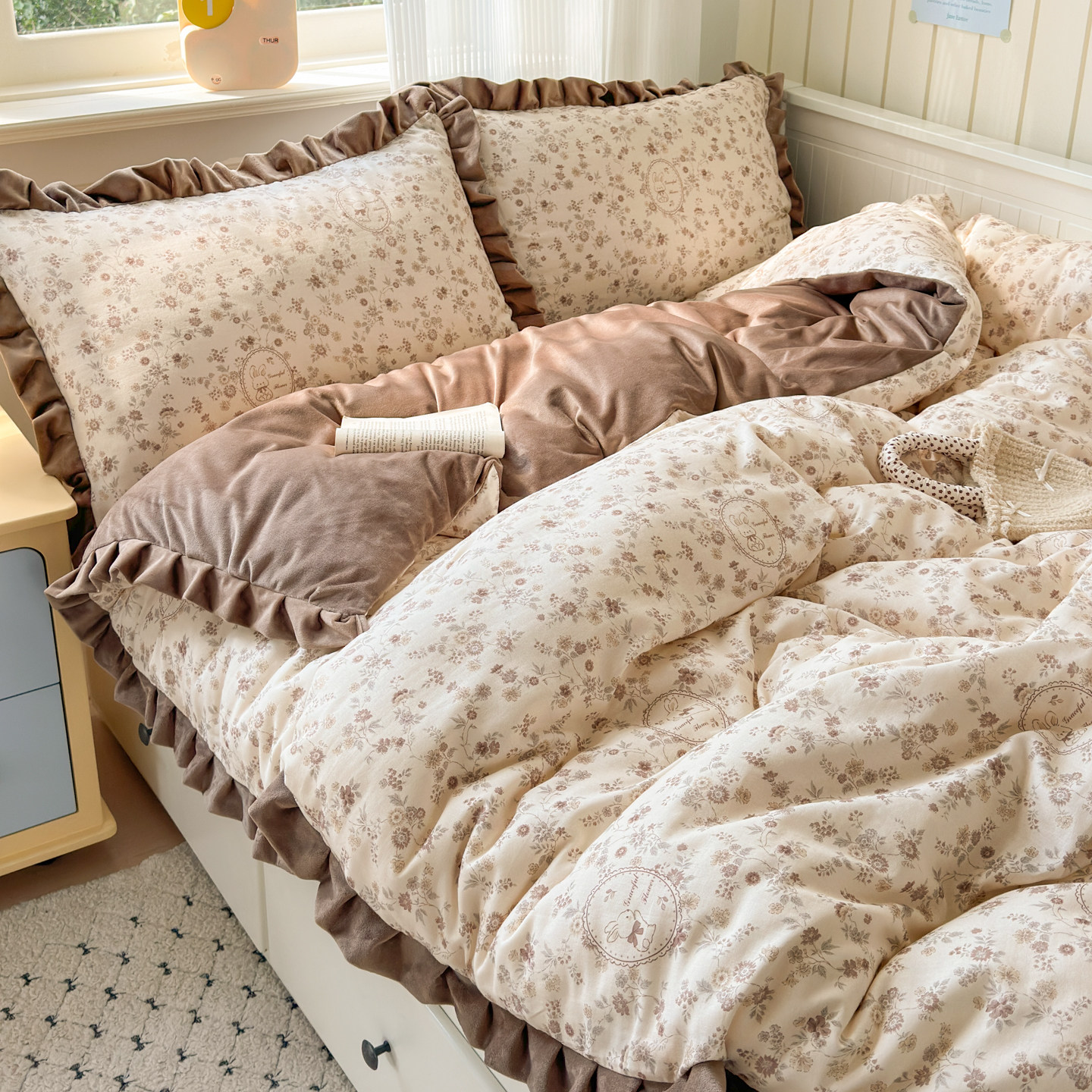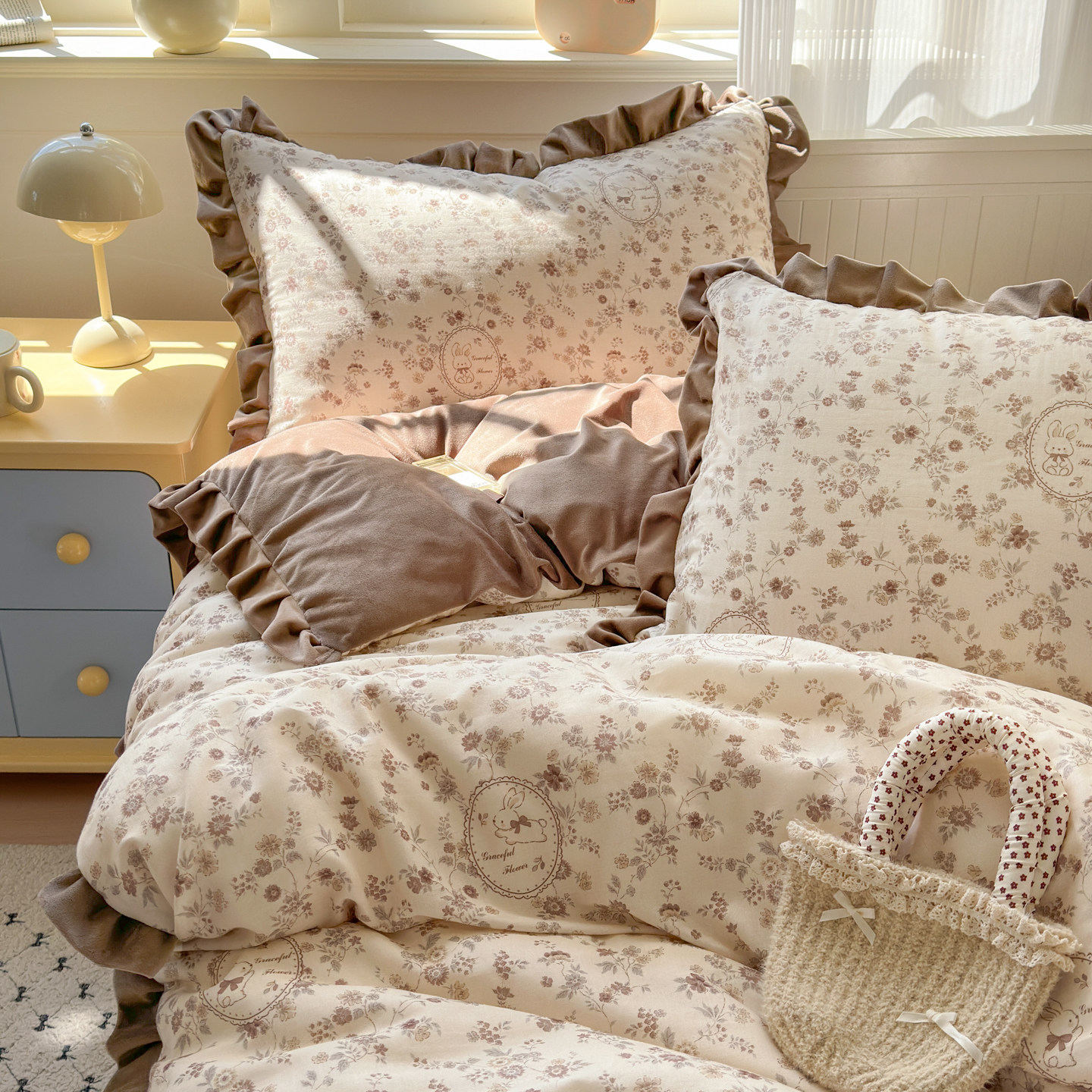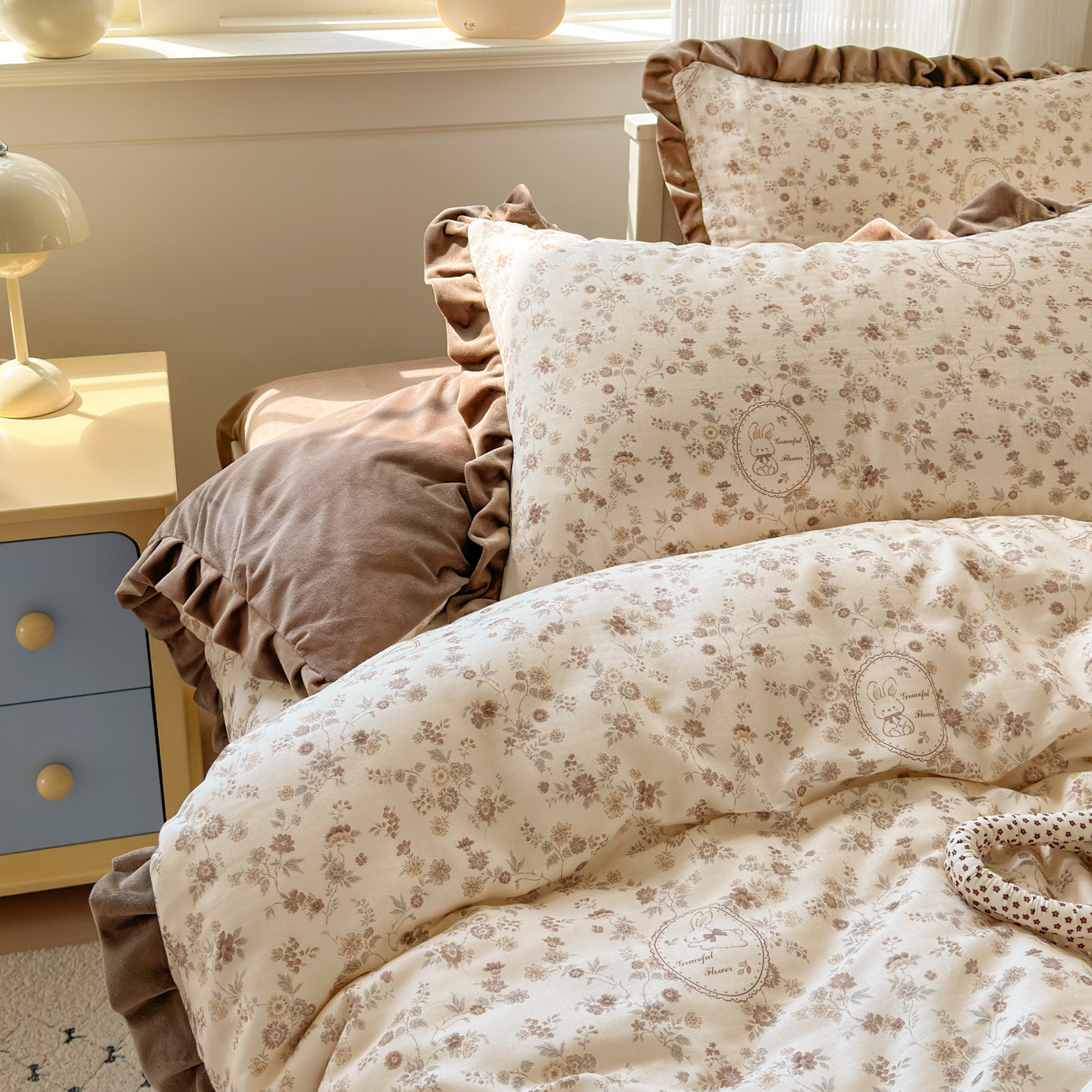 📚 法式复古兔美拉德A类母婴级全棉双层纱+韩国绒被套纯棉被罩四件套