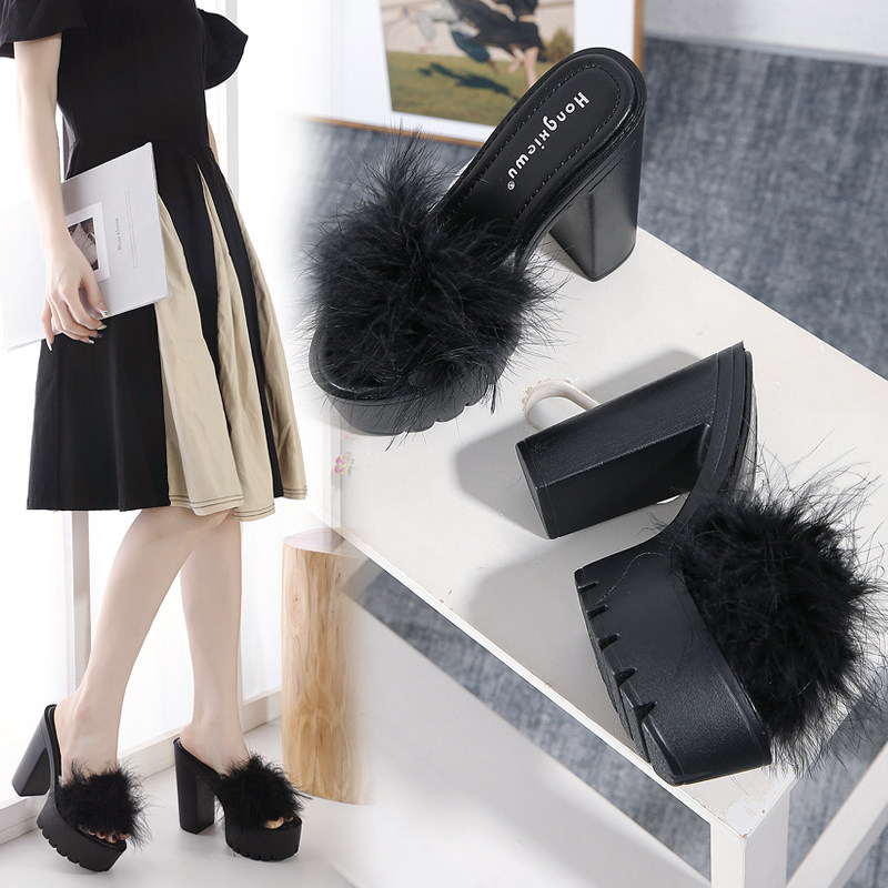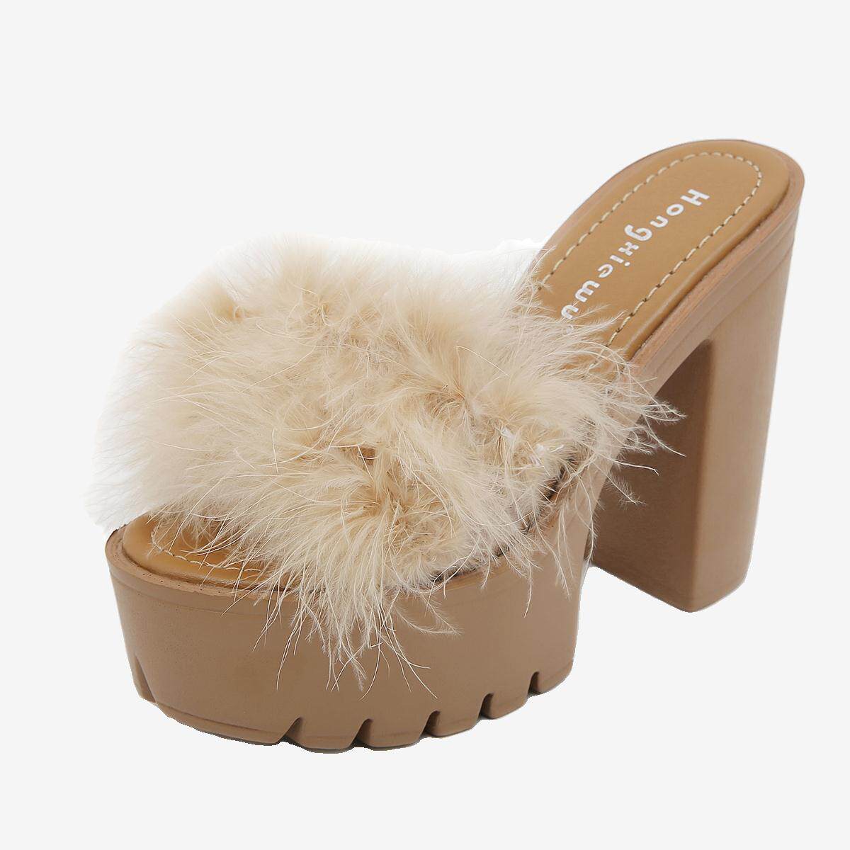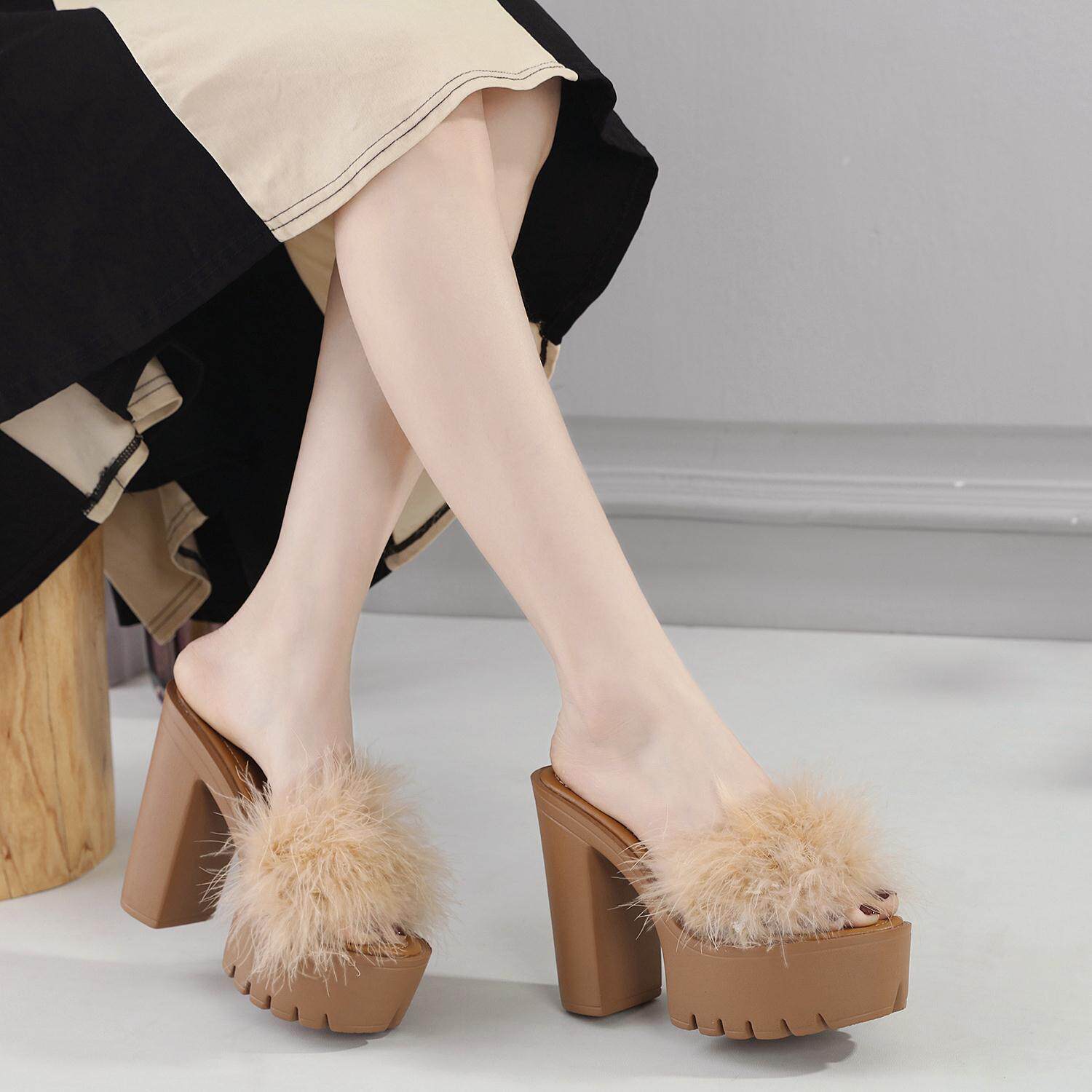📚 跨境外贸粗跟防水台13CM高跟时尚毛毛凉拖鞋 Lazada Women Sandas