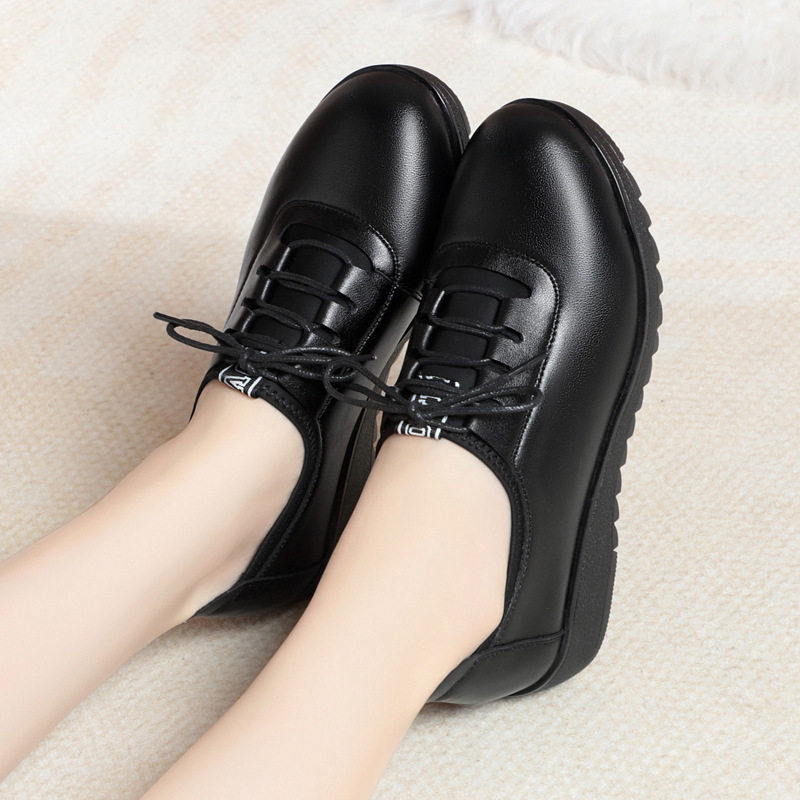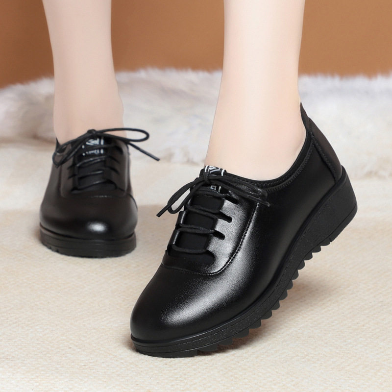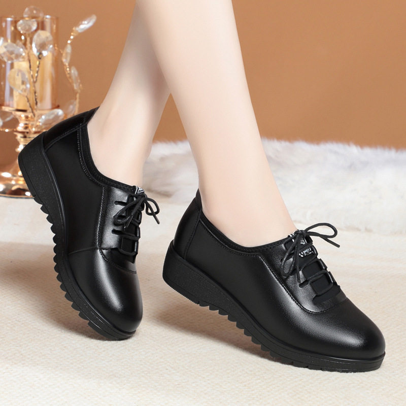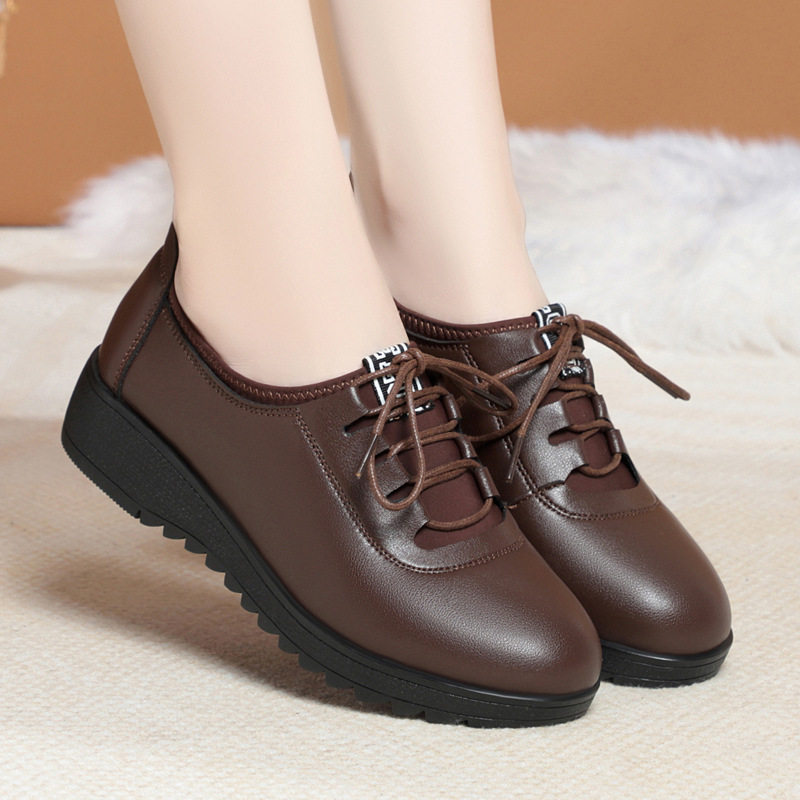 📚 进口妈妈鞋真皮平底软牛皮防滑女士皮鞋中老年单皮鞋矮跟加绒棕色