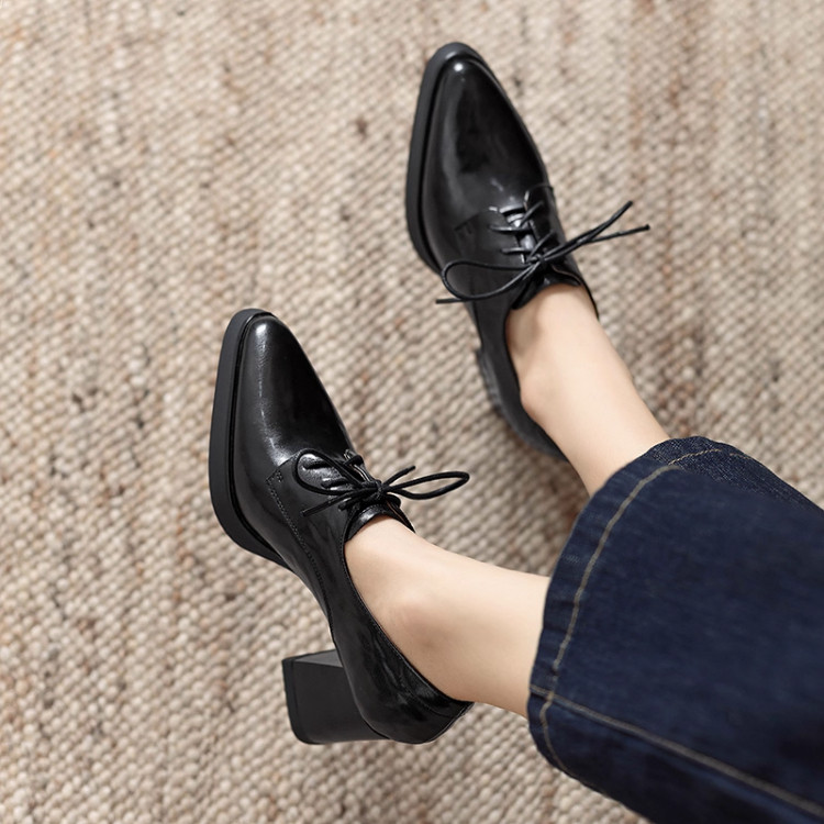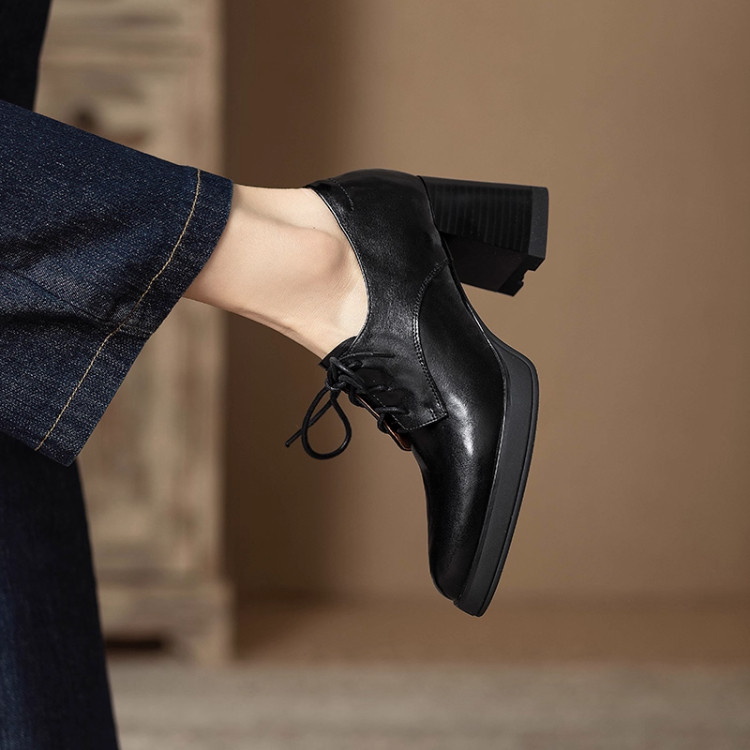 📚 巨显高复古棕色深口小皮鞋女英伦尖头真皮系带粗跟小个子高跟单鞋