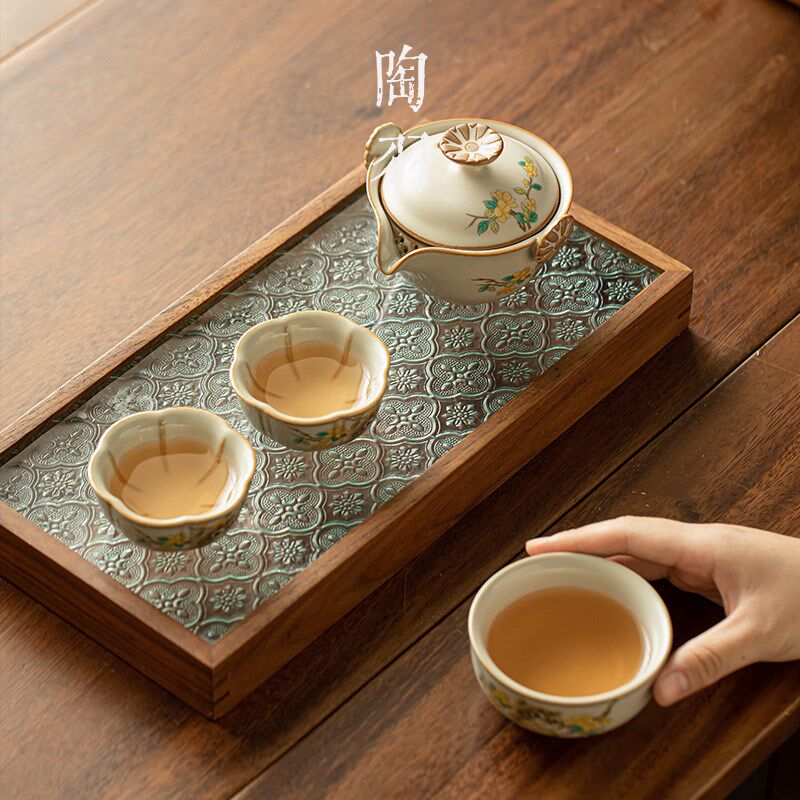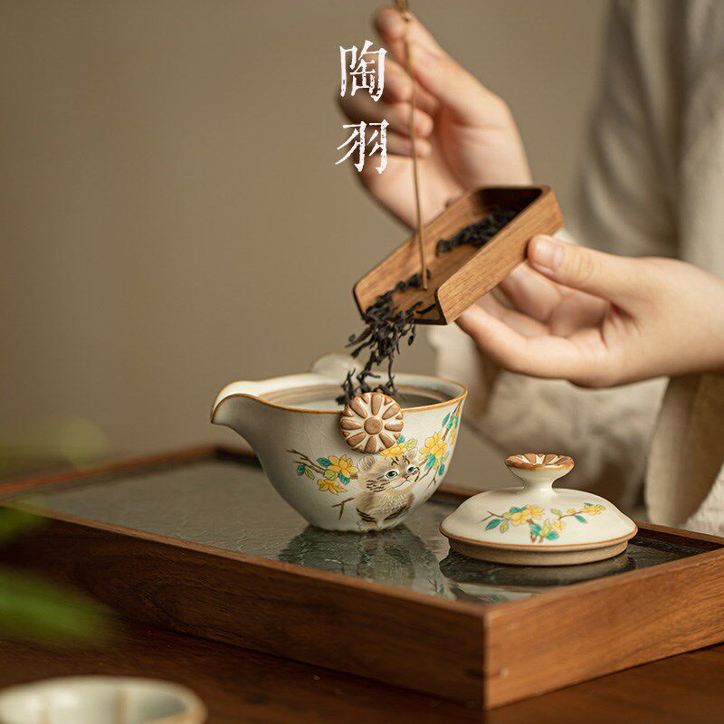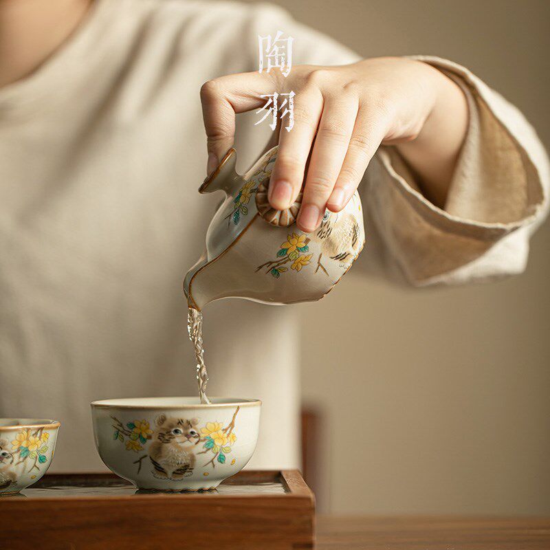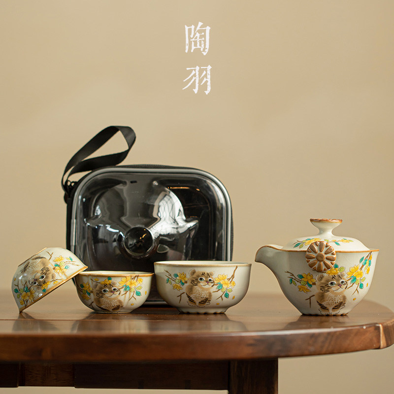 📚 汝窑猫咪旅行茶具家用便携快客杯一壶三杯户外随身功夫茶具套装