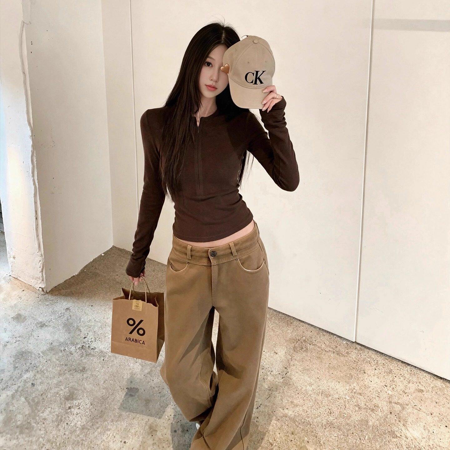 📚 辣妹白色半拉链v领长袖t恤女秋冬正肩修身短款内搭打底衫运动上衣