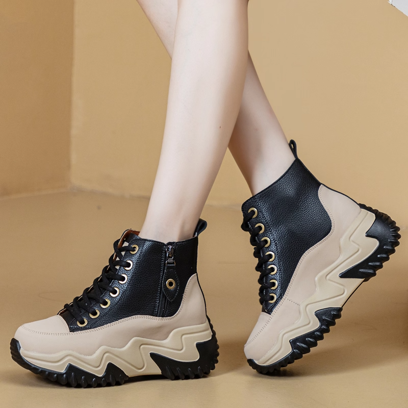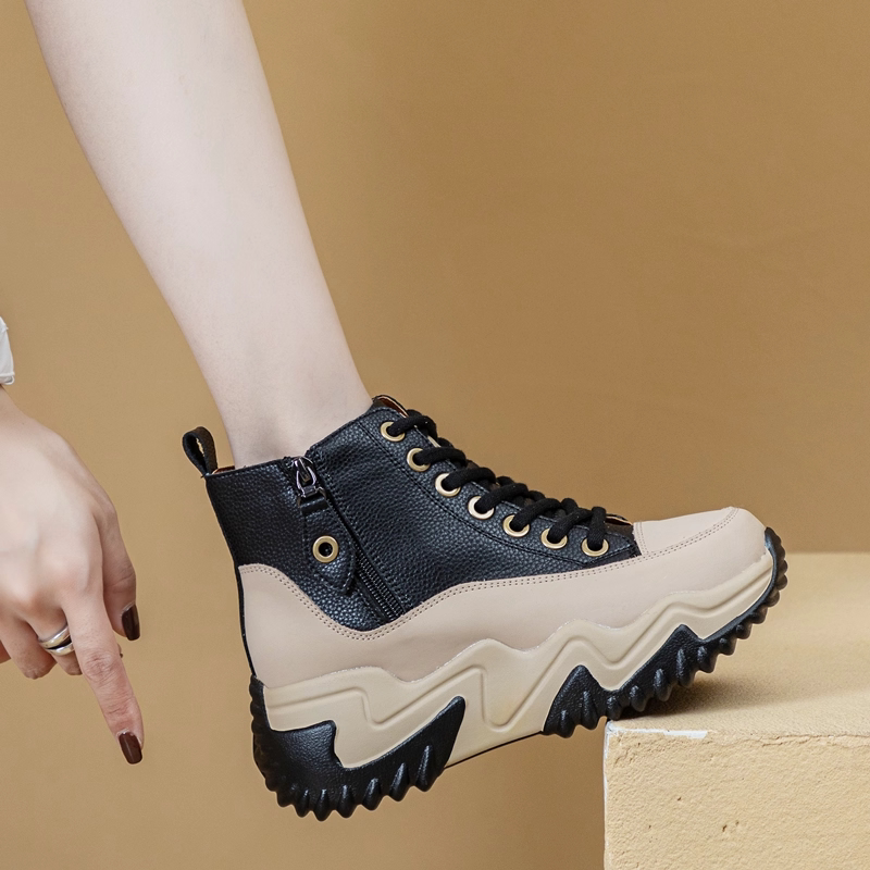 📚 2025秋冬新款爆款高帮内增高真皮厚底拼色女靴加绒加厚运动休闲鞋