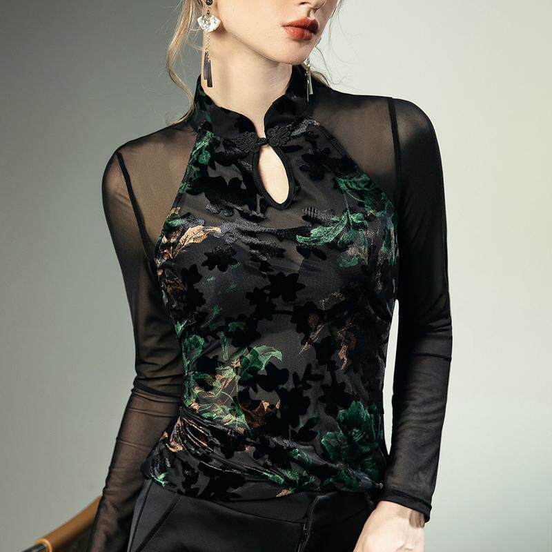 📚 性感镂空薄款半透视蕾丝衫新中式国风上衣女t恤旗袍领网纱打底衫