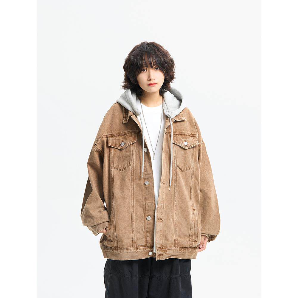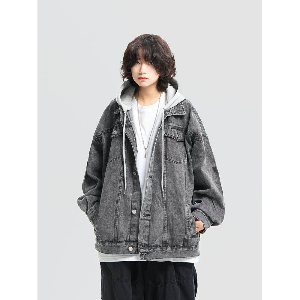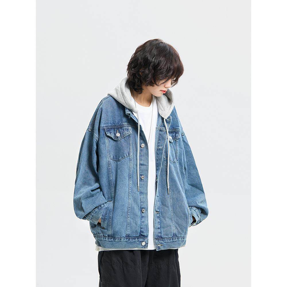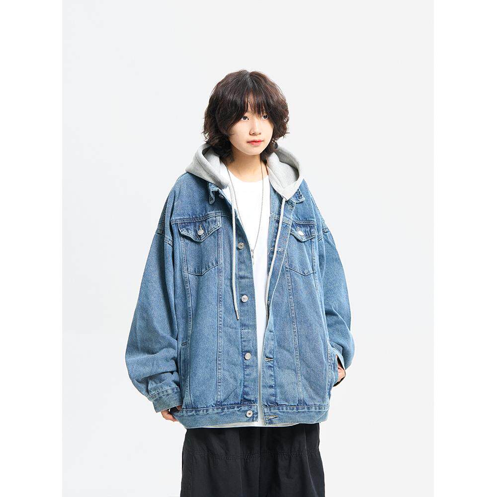 📚 阿于呆秋冬日系假两件水洗连帽牛仔外套男宽松休闲情侣工装夹克女