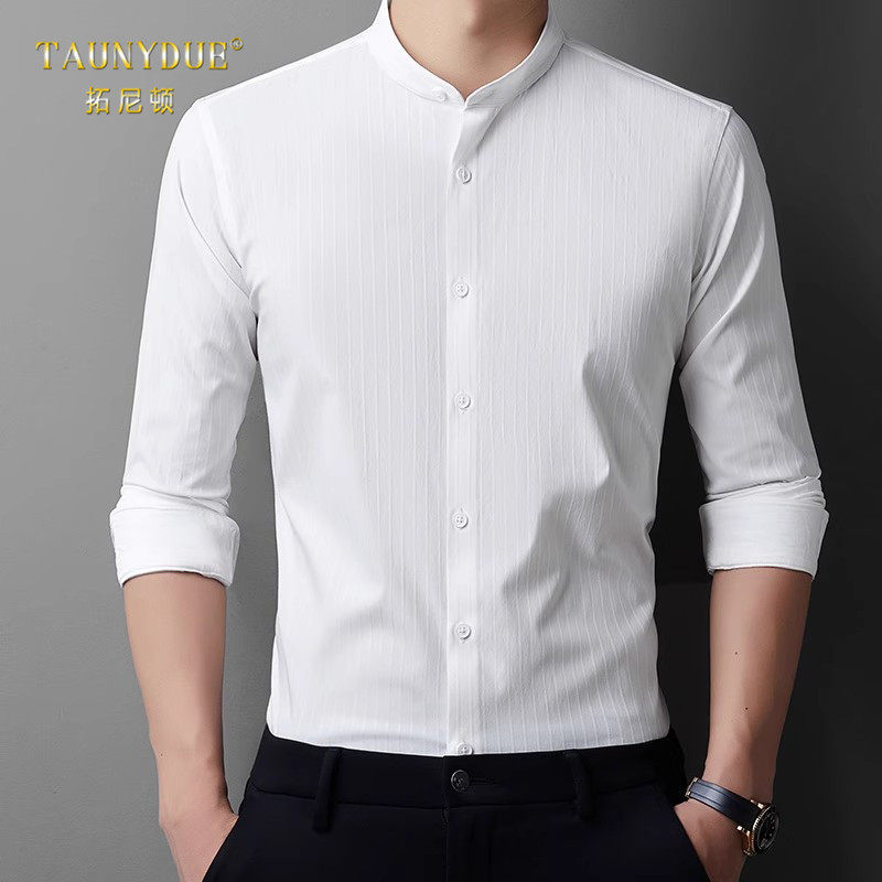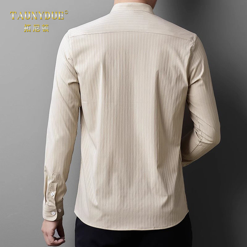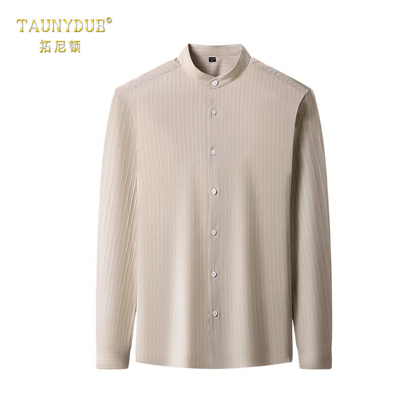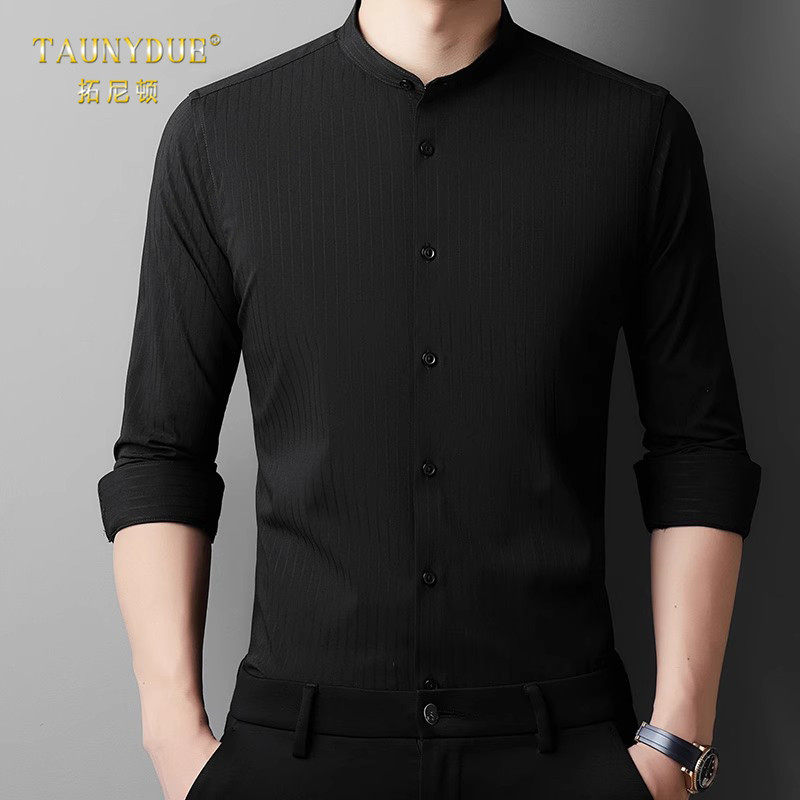 📚 时尚潮流高级感痞帅竖条纹提花休闲衬衣立领长袖衬衫男春秋冬薄款