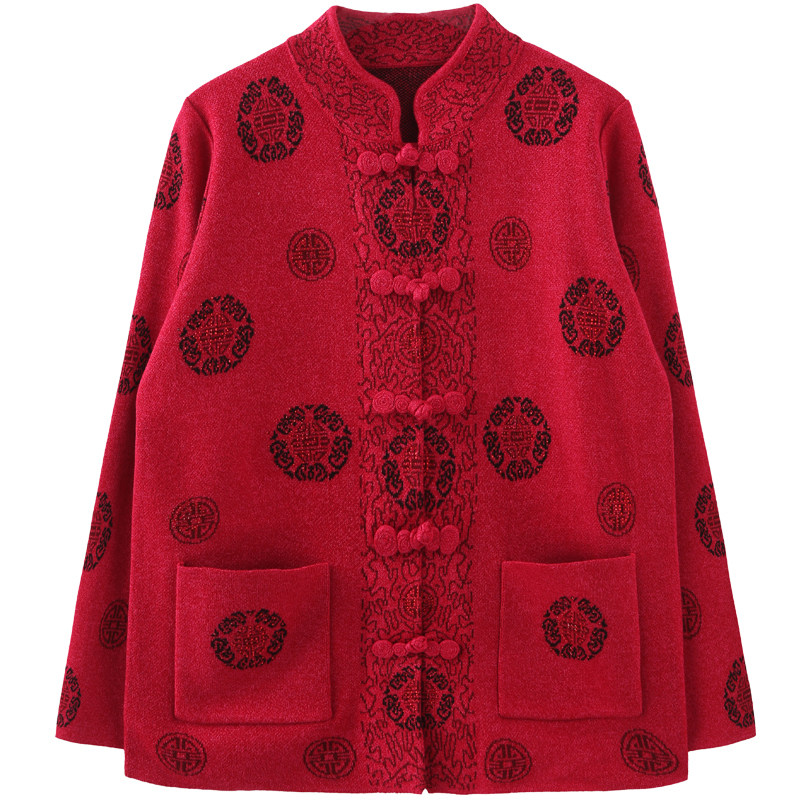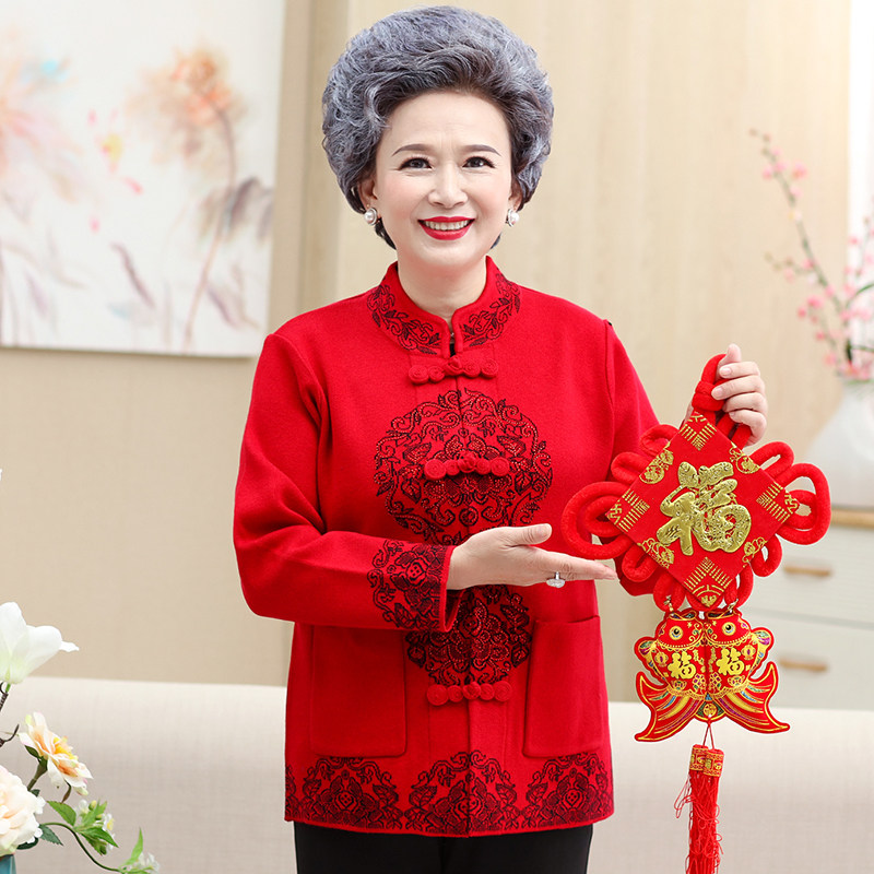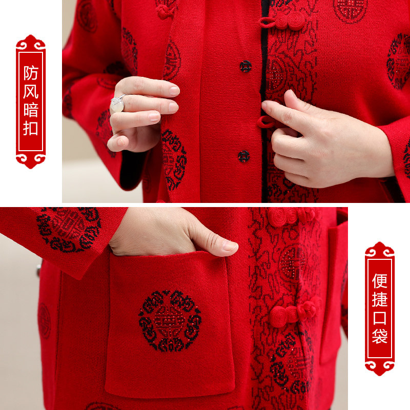 📚 中老年妈妈秋冬本命年红色毛衣外套老奶奶婚礼唐装女羊毛针织开衫