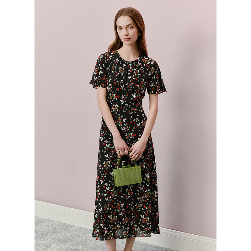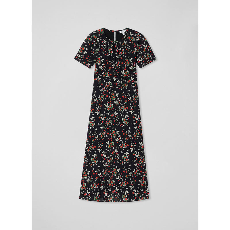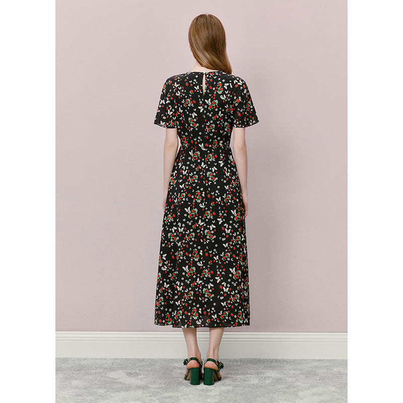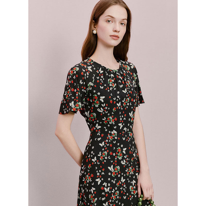 📚 LK BENNETT黑色碎花连衣裙圆领法式印花收腰清新桑蚕丝混纺