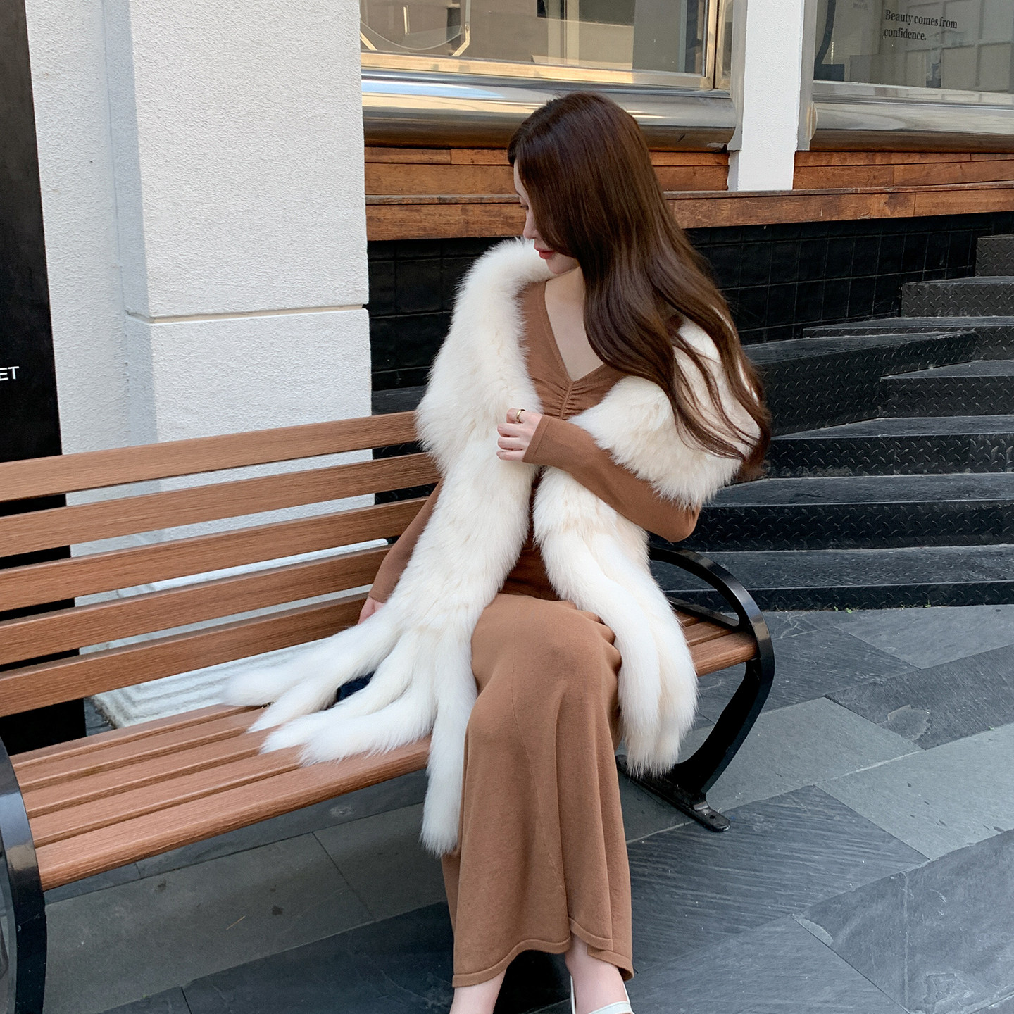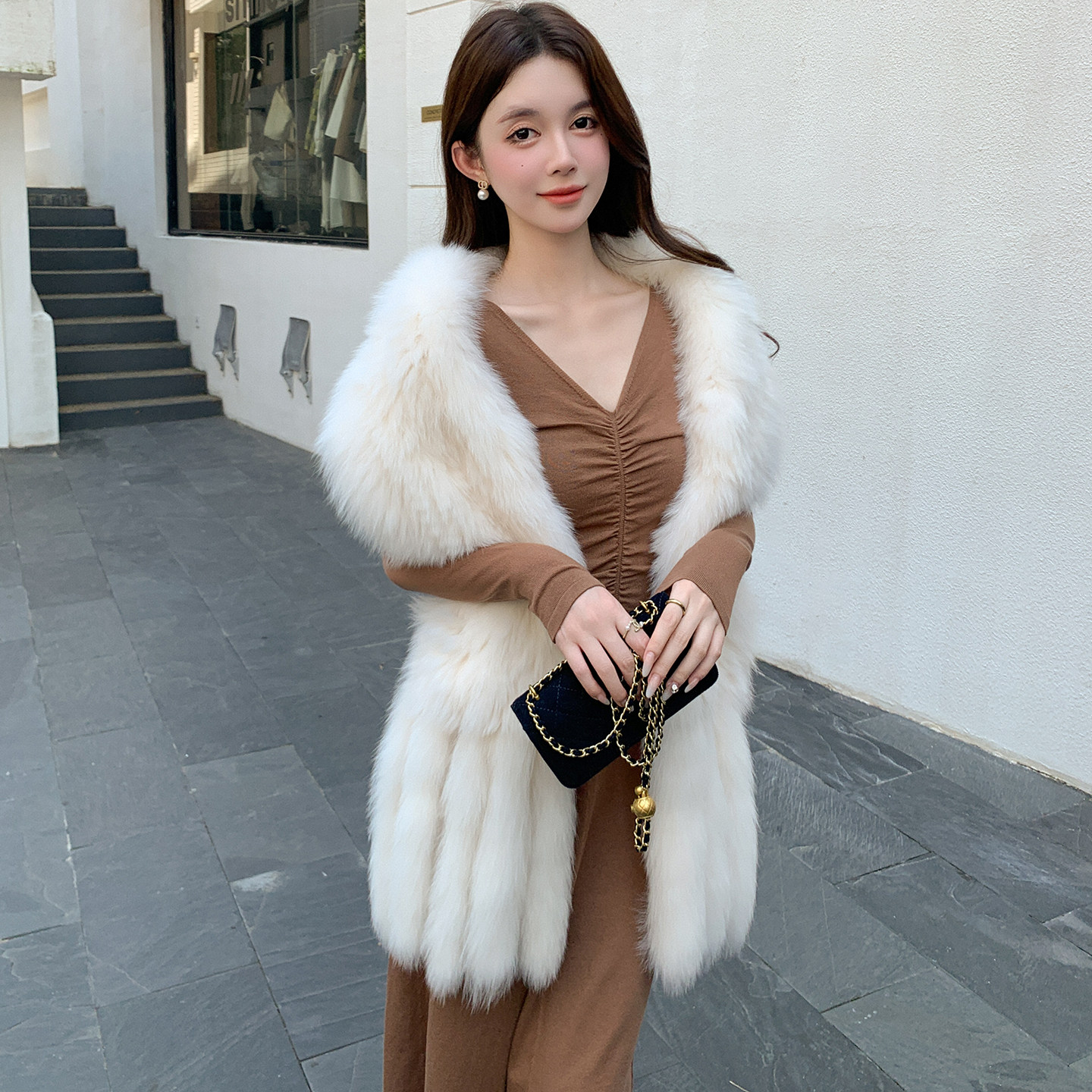 📚 韩版奶油色狐狸毛流苏披肩大围巾真毛保暖九尾狐皮草大毛领坎肩