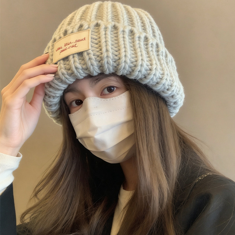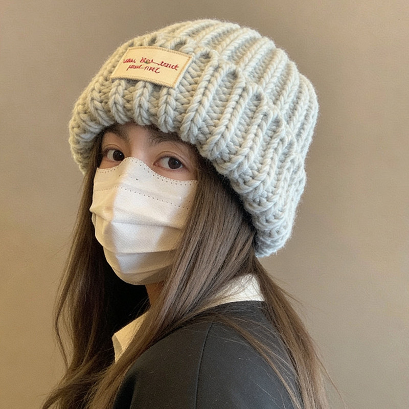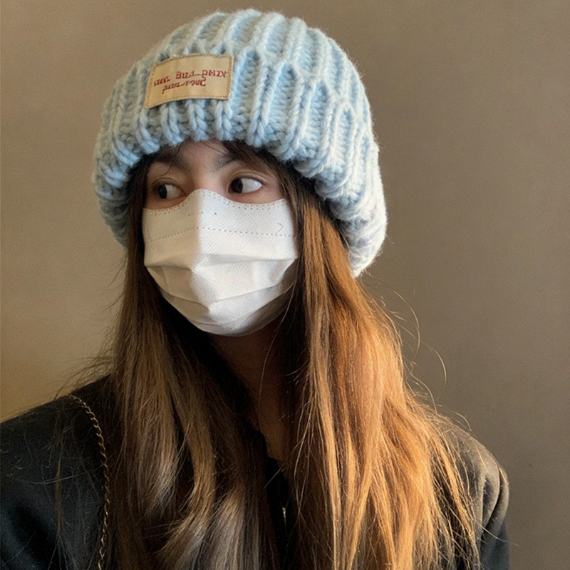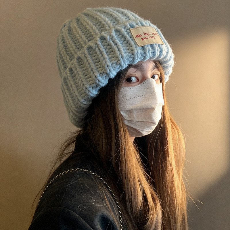 📚 蓝色粗毛线帽子女秋冬季韩系氛围感显脸小护耳针织帽大头围冷帽