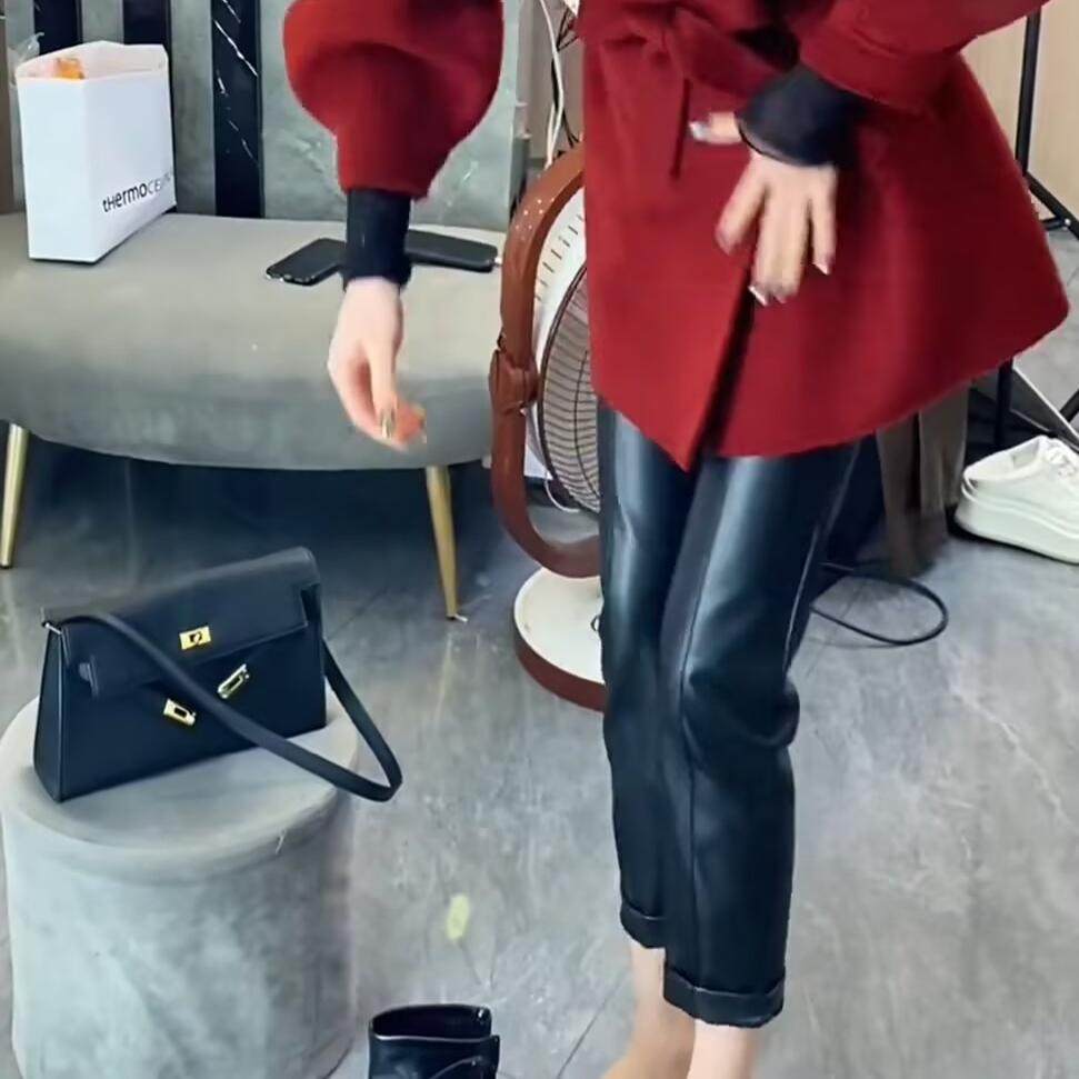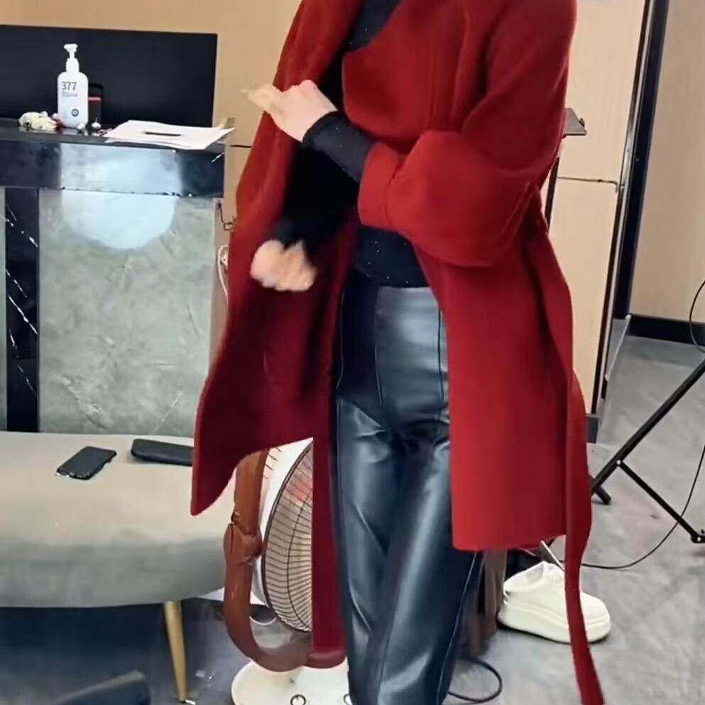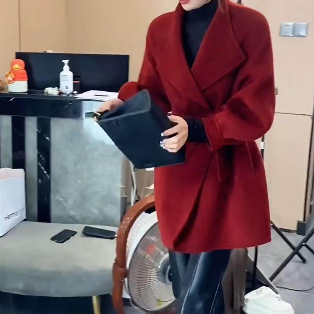 📚 高级感气质时尚呢子外套女2026春秋新款系带酒红色中长款毛呢大衣