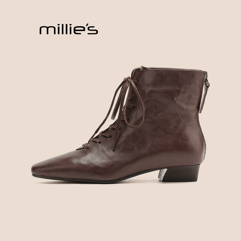 📚 MILLIE'S/妙丽短筒靴冬季加绒复古简约系带低跟英伦风靴真皮裸靴Q