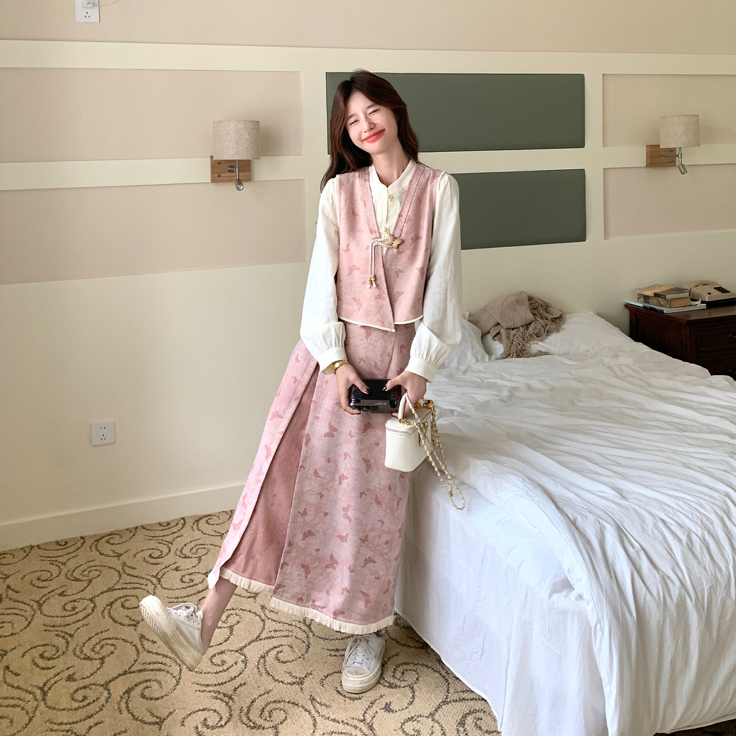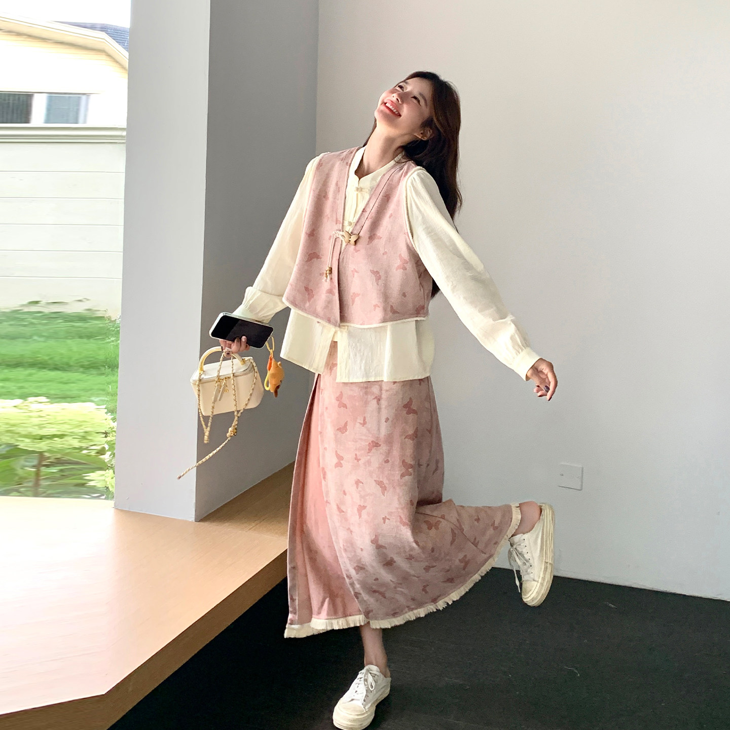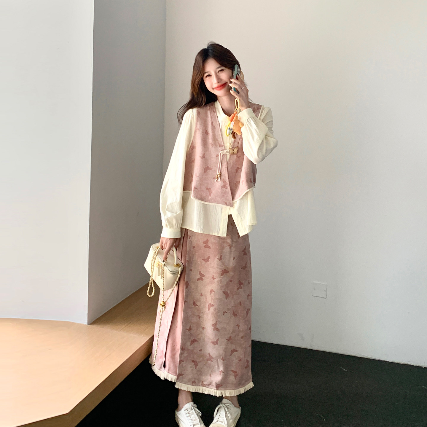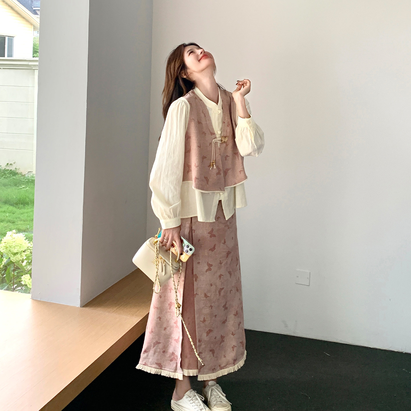 📚 新中式国风蝴蝶印花套装裙女2026春新款盘扣马甲衬衫半身裙三件套