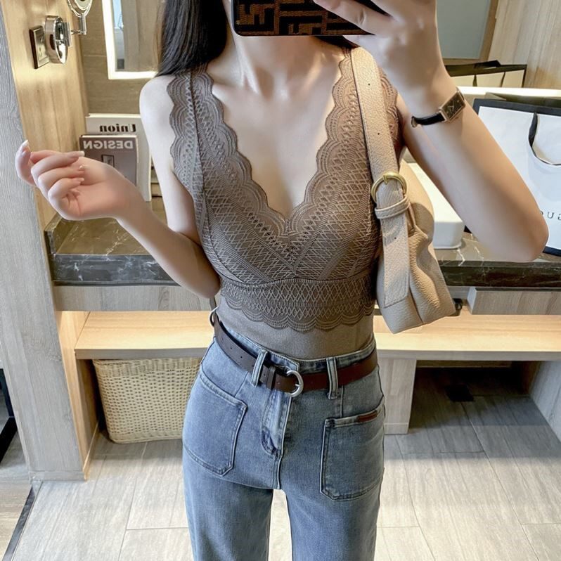 📚 蕾丝保暖背心带胸垫一体式德绒发热秋冬内搭加绒无痕打底衫上衣潮