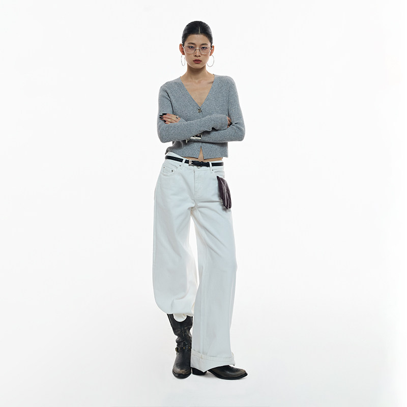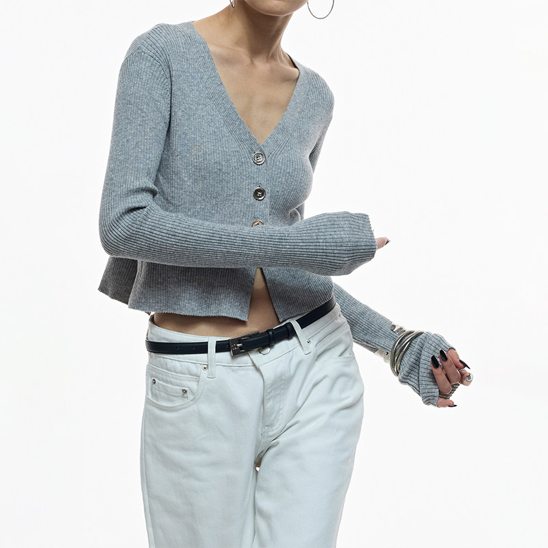 📚 ourhour 后背刺绣 灰色V领短款羊毛混纺开衫 女秋设计感纯色毛衣