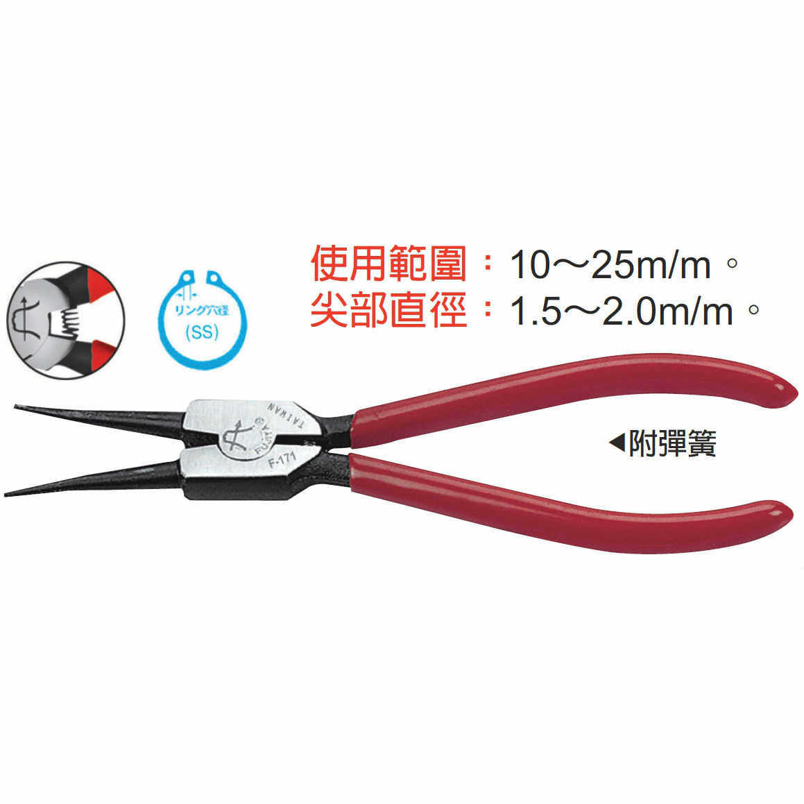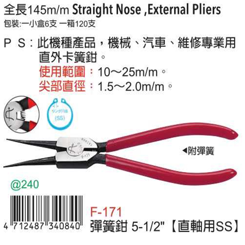 📚 台湾进口原装F-171富具亚FUJIYA弹簧钳5寸外卡(直轴用SS)140mm