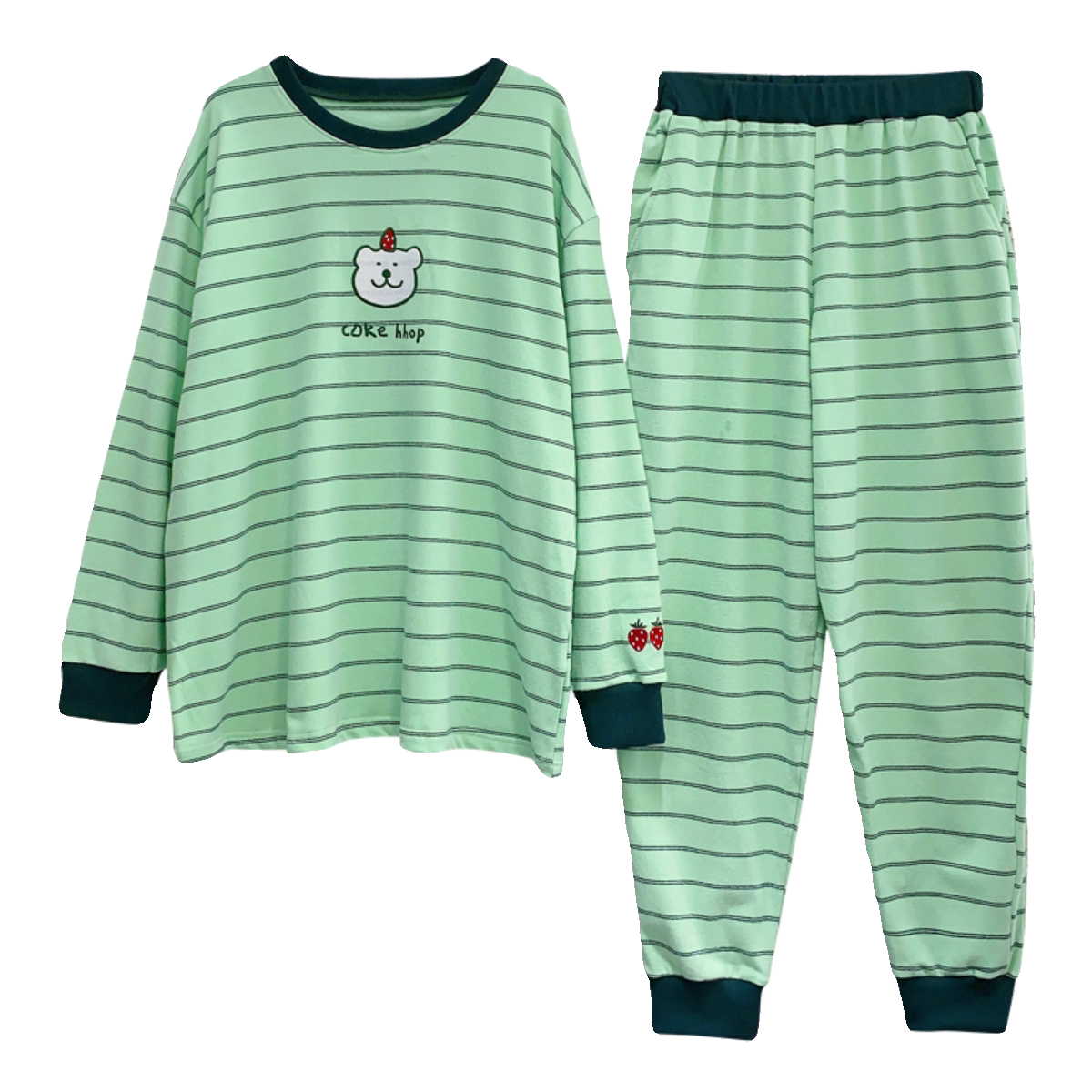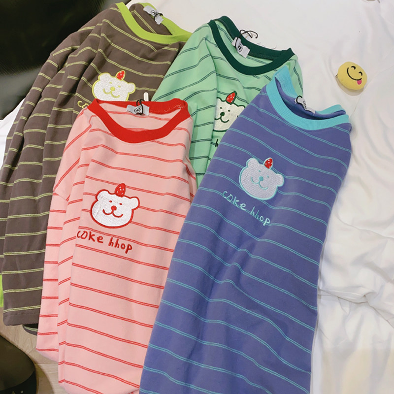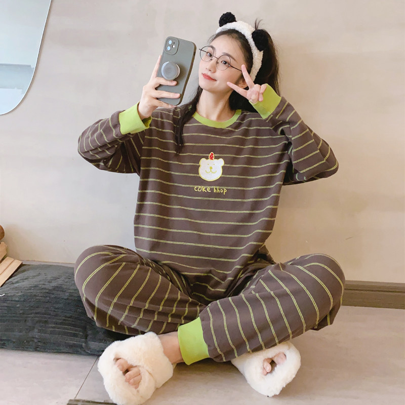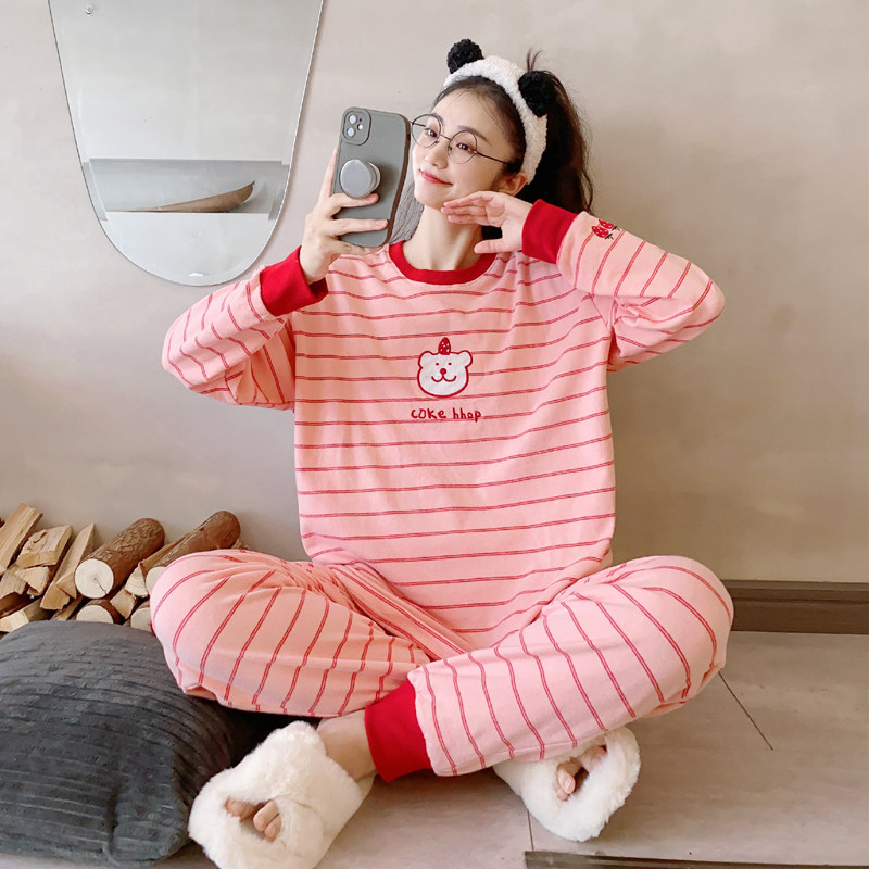 📚 【加绒款】小熊条纹长袖睡衣女秋冬季宽松大码加厚保暖家居服可爱