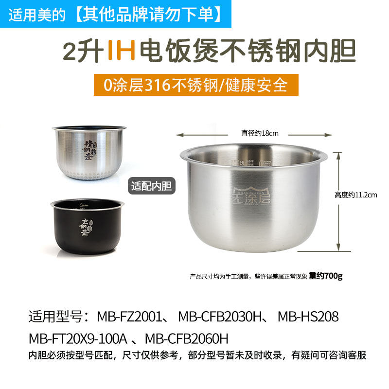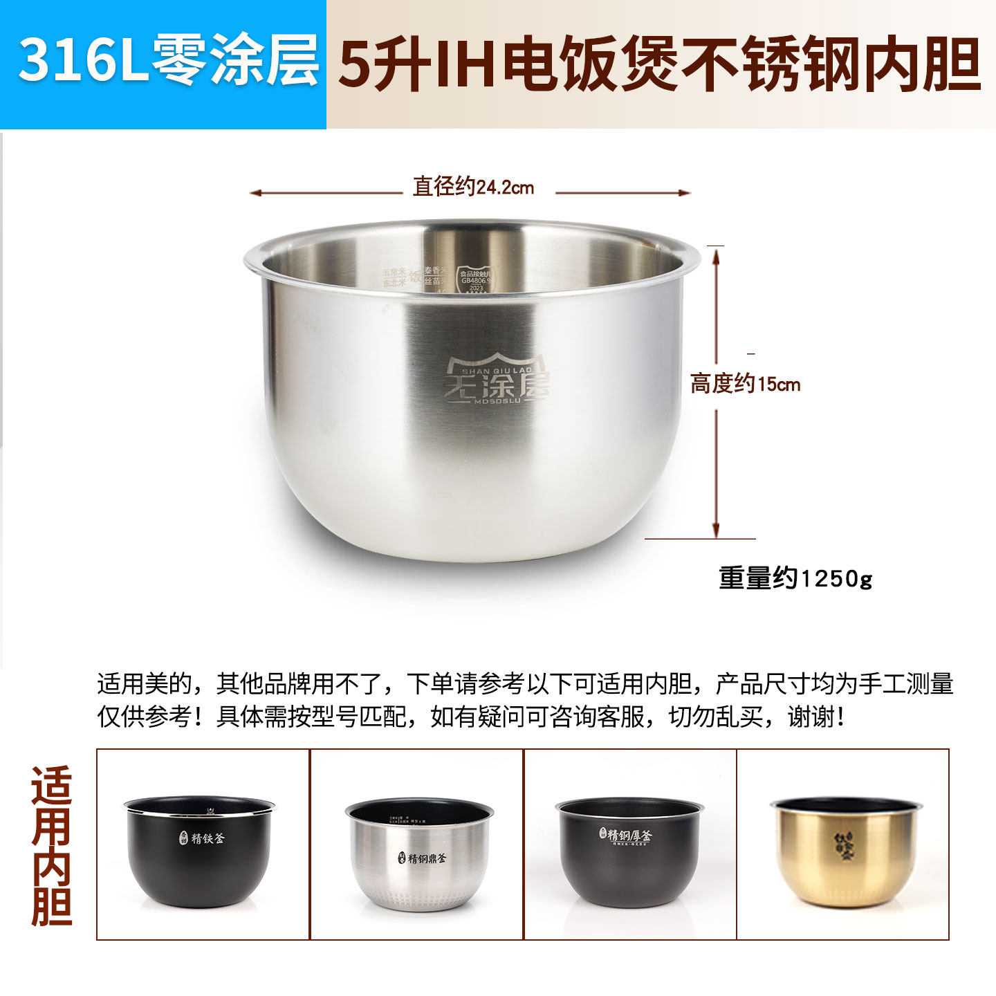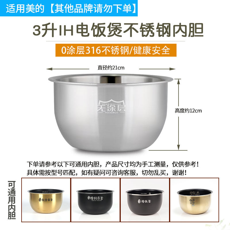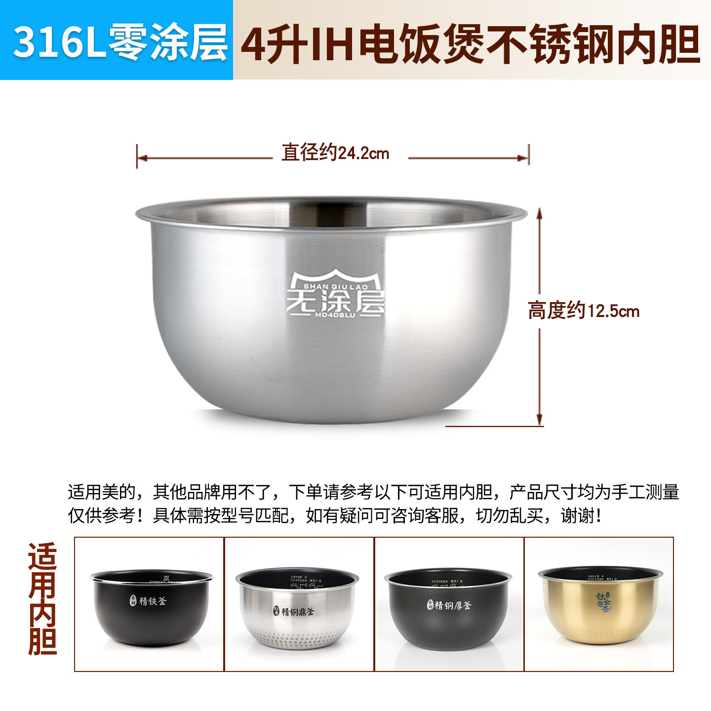 📚 适用美的IH电饭煲316不锈钢内胆2升3升4升5升电饭锅内胆0涂层配件