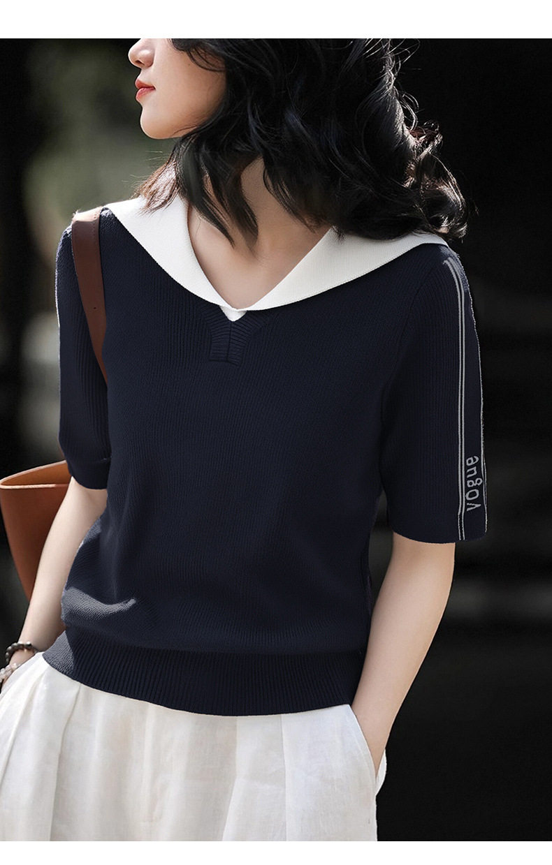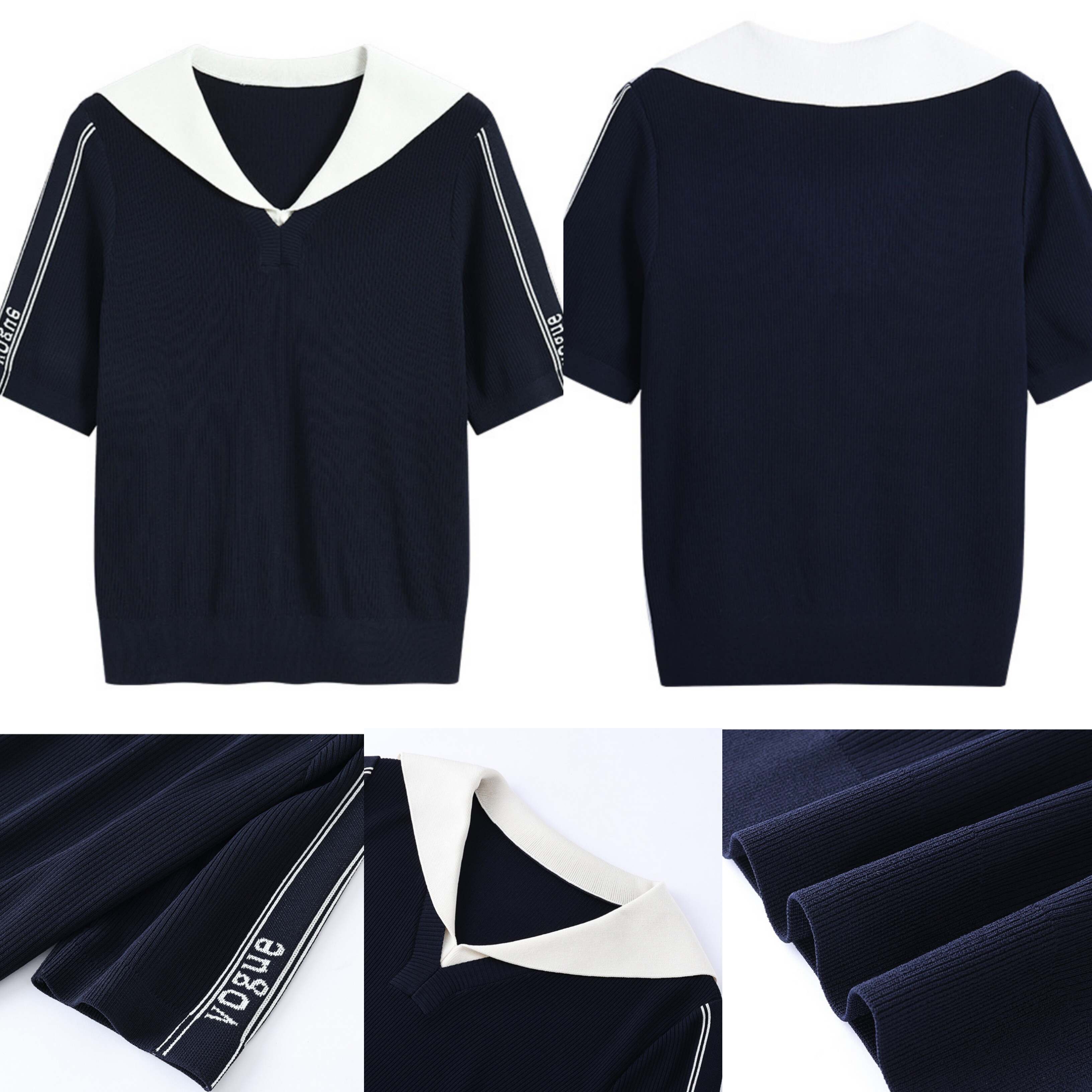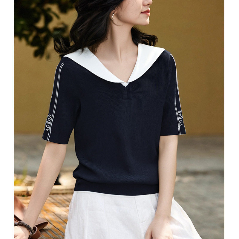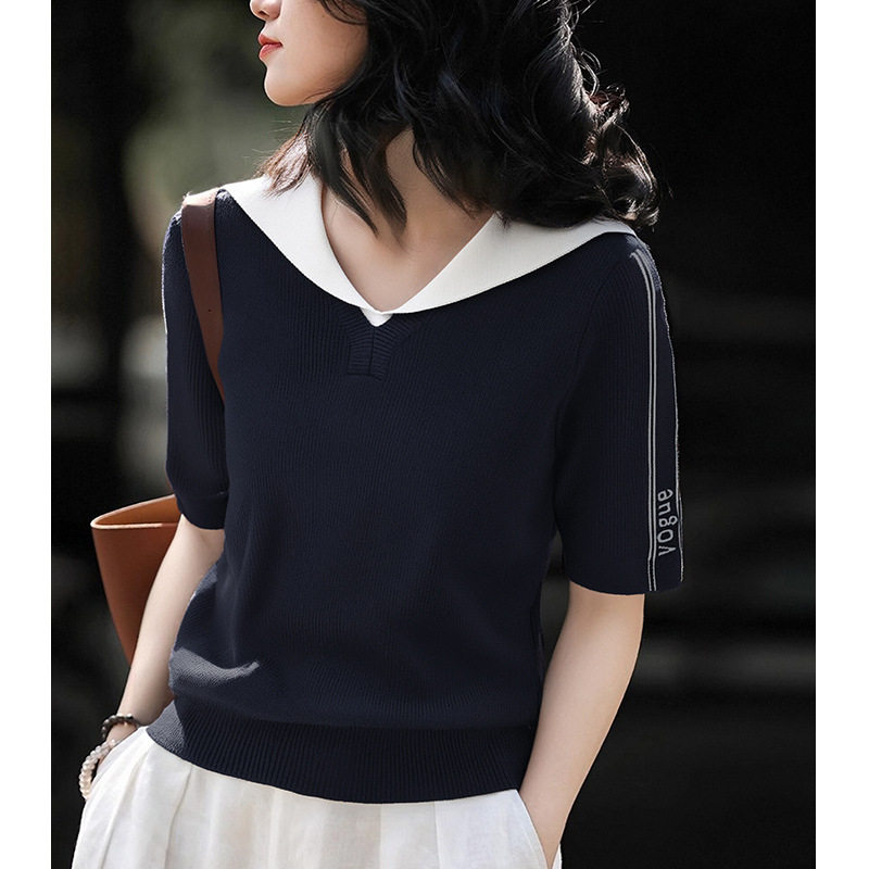 📚 小香风海军领短袖字母针织衫女2025夏季新款气质减龄宽松显瘦上衣