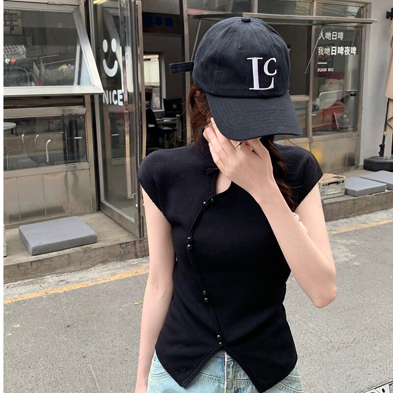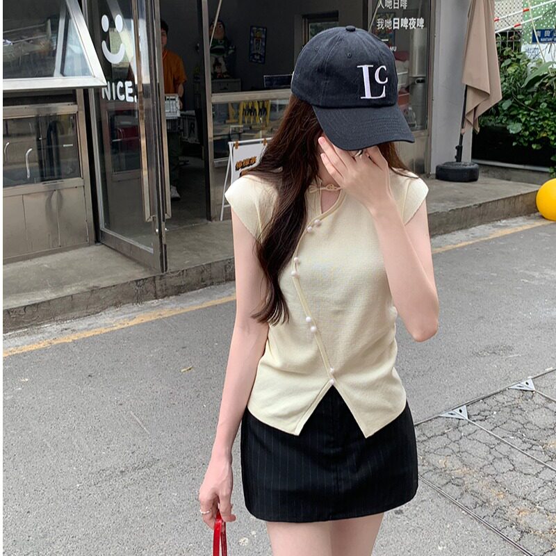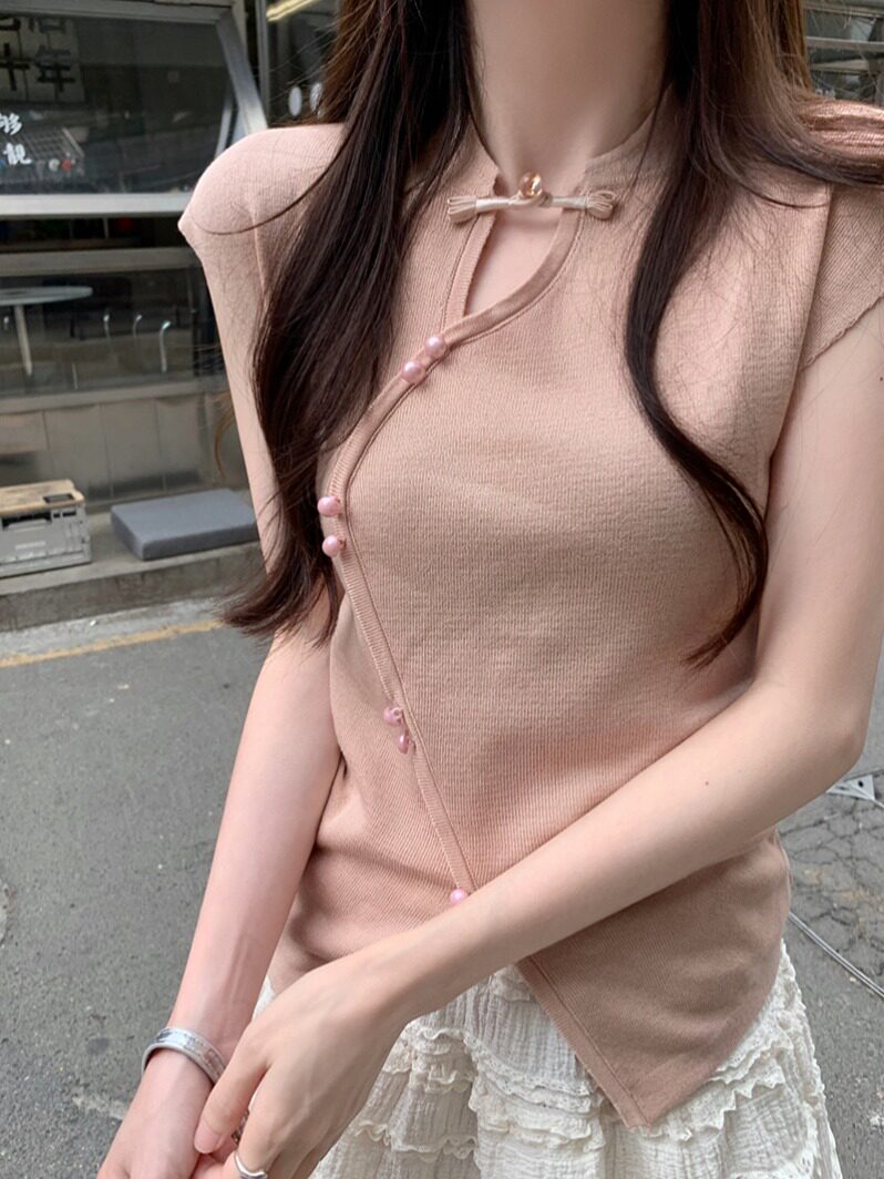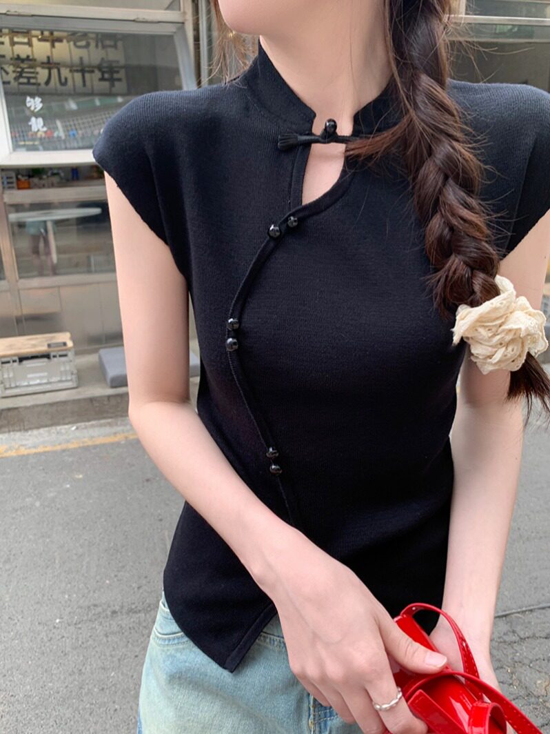 📚 新中式国风设计感盘扣立领2026年夏季打底衫飞飞袖气质针织衫上衣