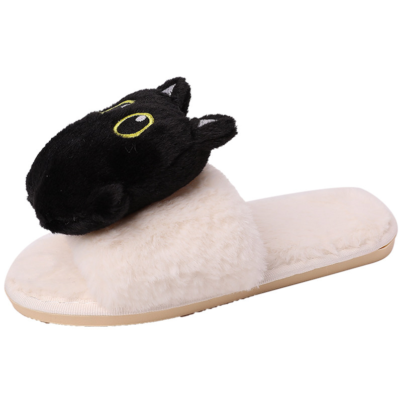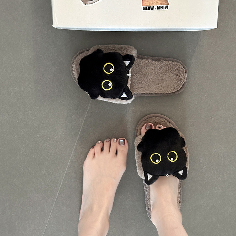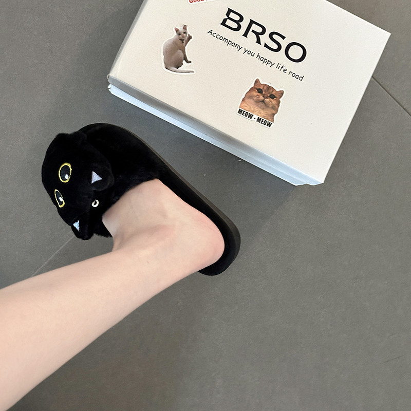 📚 日本OFFCAT纯色简约可爱卡通毛绒小黑猫棉拖鞋女2025冬季新款外穿