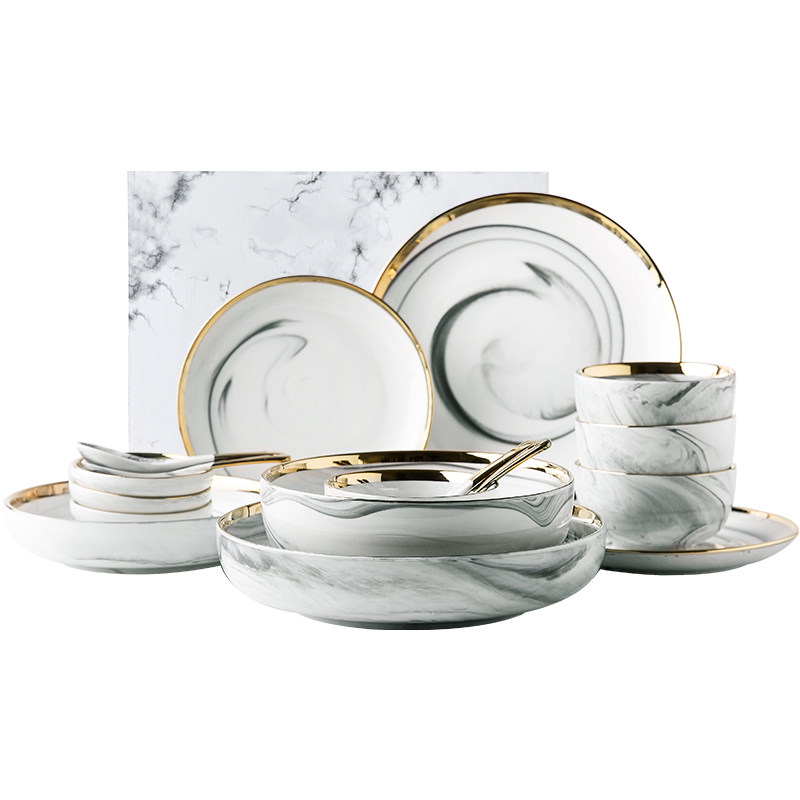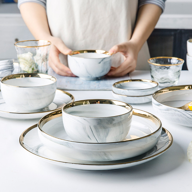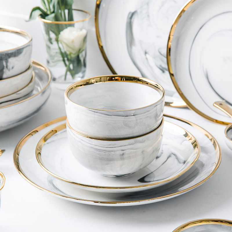 📚 欧式大理石纹轻奢餐具套装金边陶瓷餐具家用陶瓷碗盘碗碟组合套装