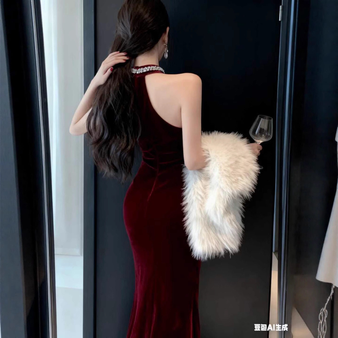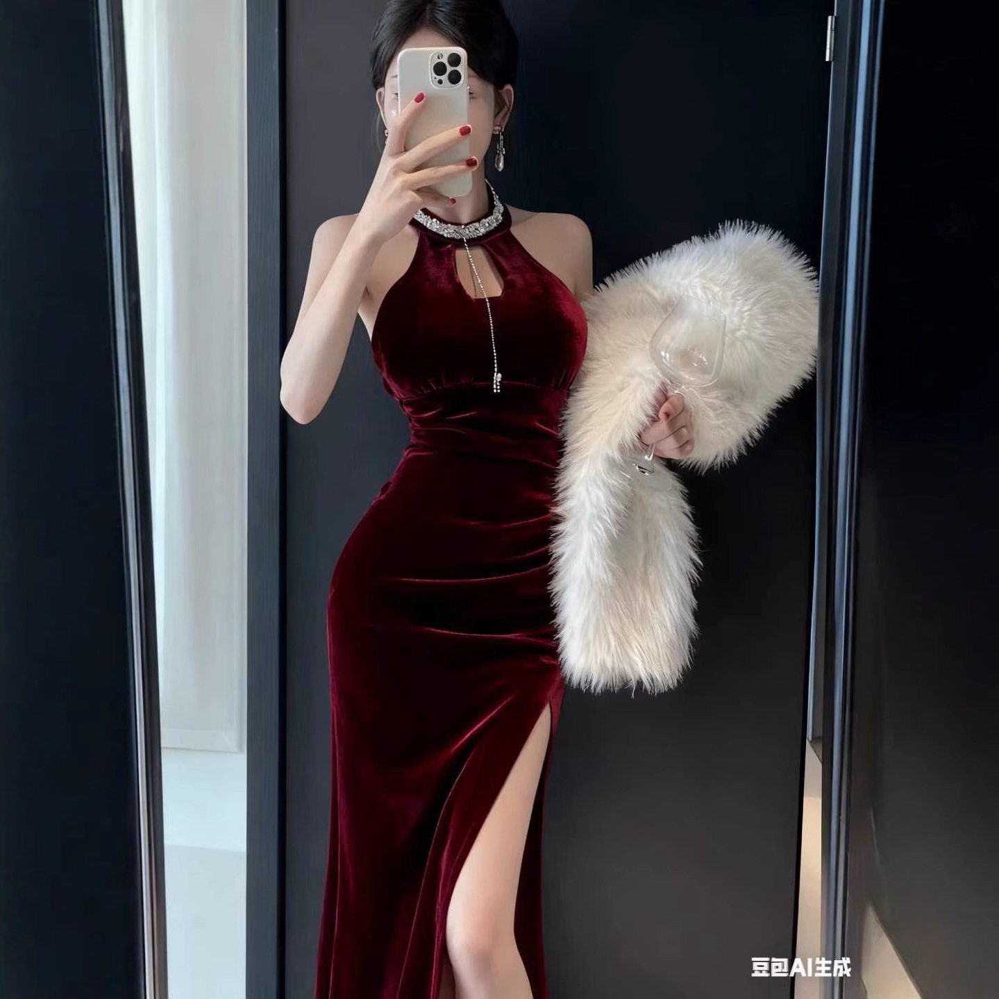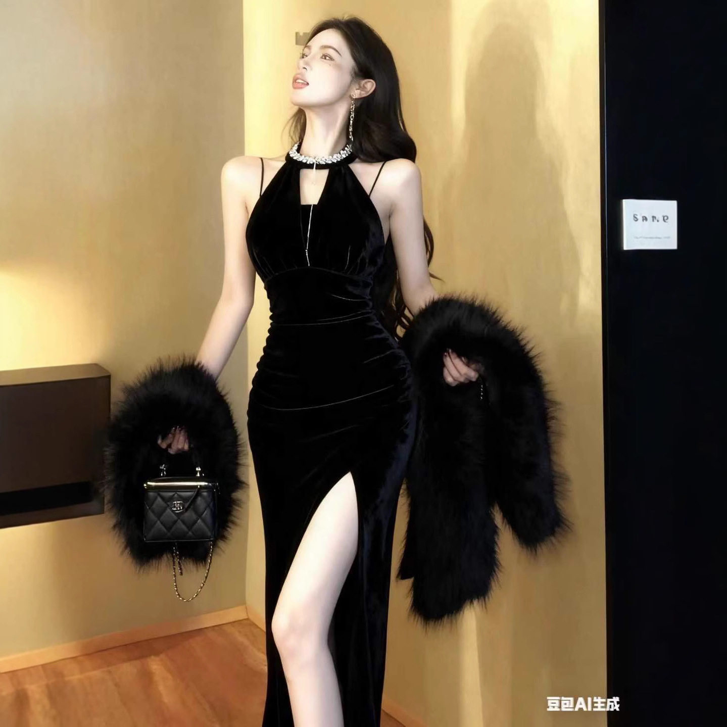 📚 2026新款时尚舒适纯色低胸丝绒挂脖修身显瘦打底无袖内搭长裙礼服