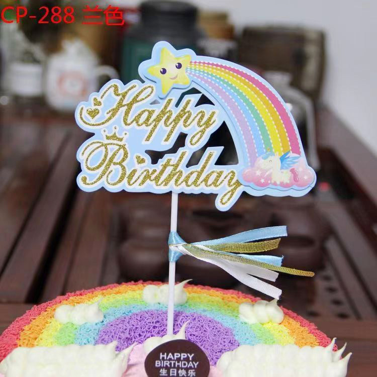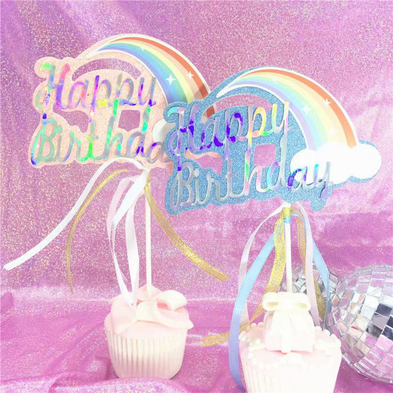 📚 粉红色彩虹云朵流苏插旗双层镭射生日蛋糕装饰happy birthday插牌