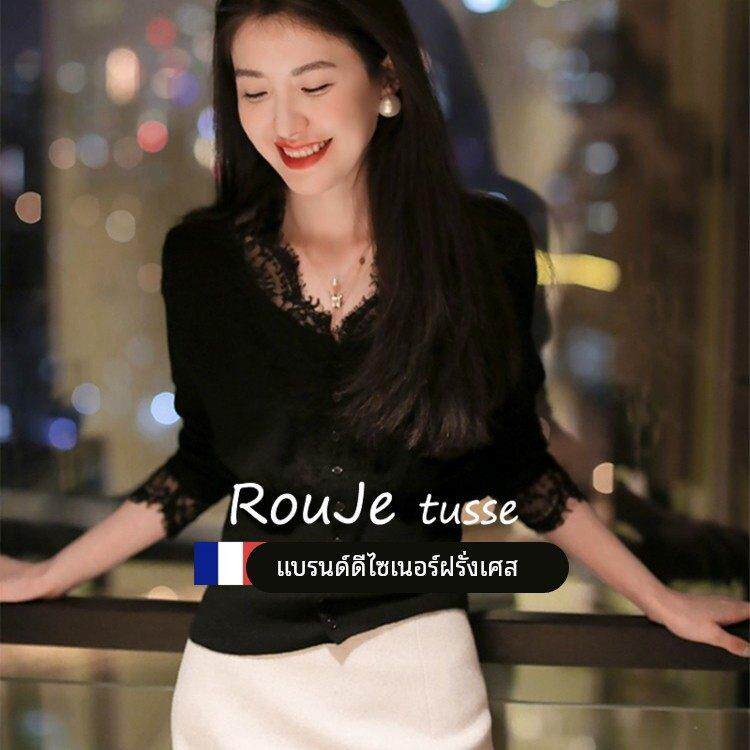 📚 Rouje tusse灰色花边V领套头羊绒毛衣女秋冬款软糯针织衫羊毛上衣