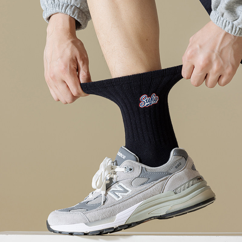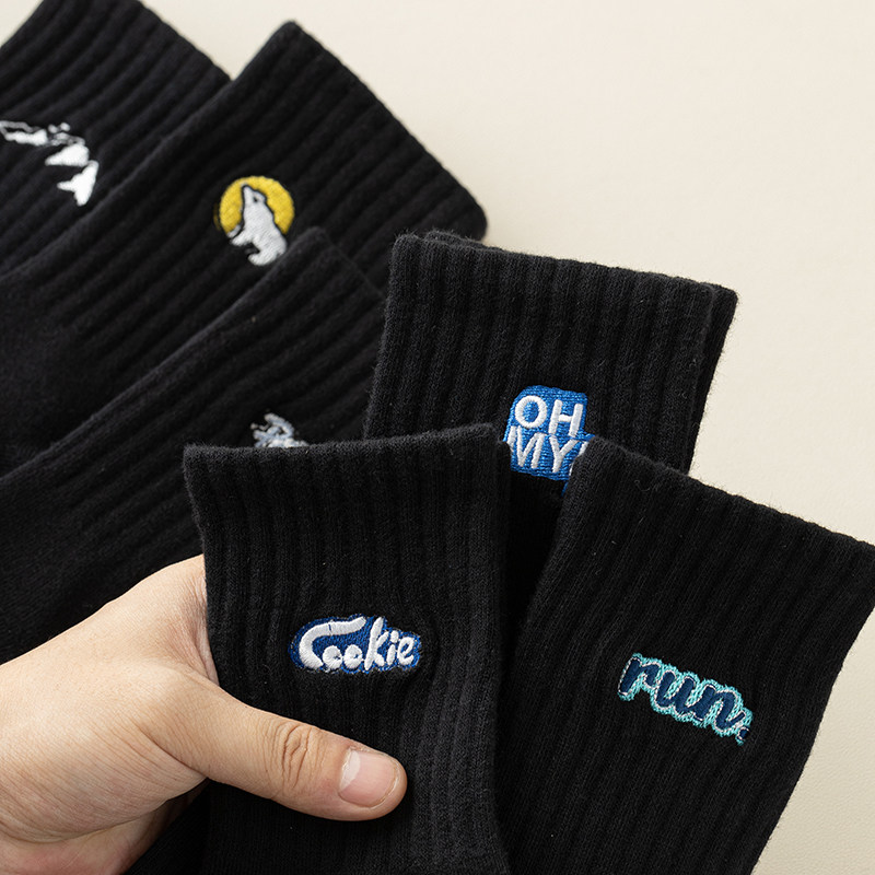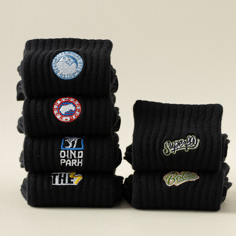 📚 黑色袜子男女中筒袜秋冬季纯棉防臭吸汗ins潮刺绣情侣运动袜长筒