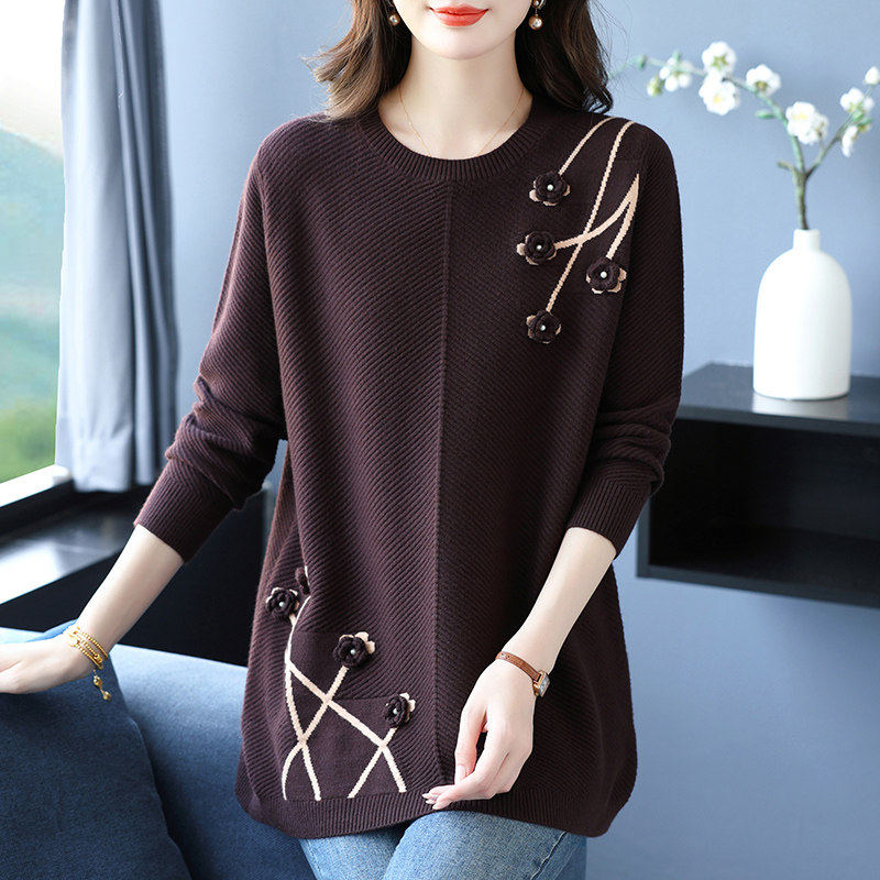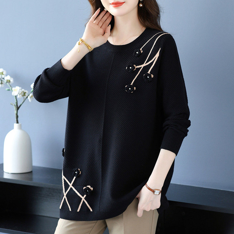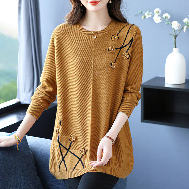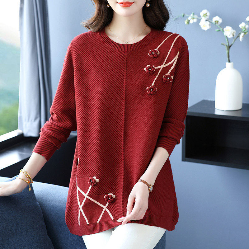 📚 胖妈妈装中国风扎花圆领毛衣女中长款宽松大码遮臀羊毛针织打底衫