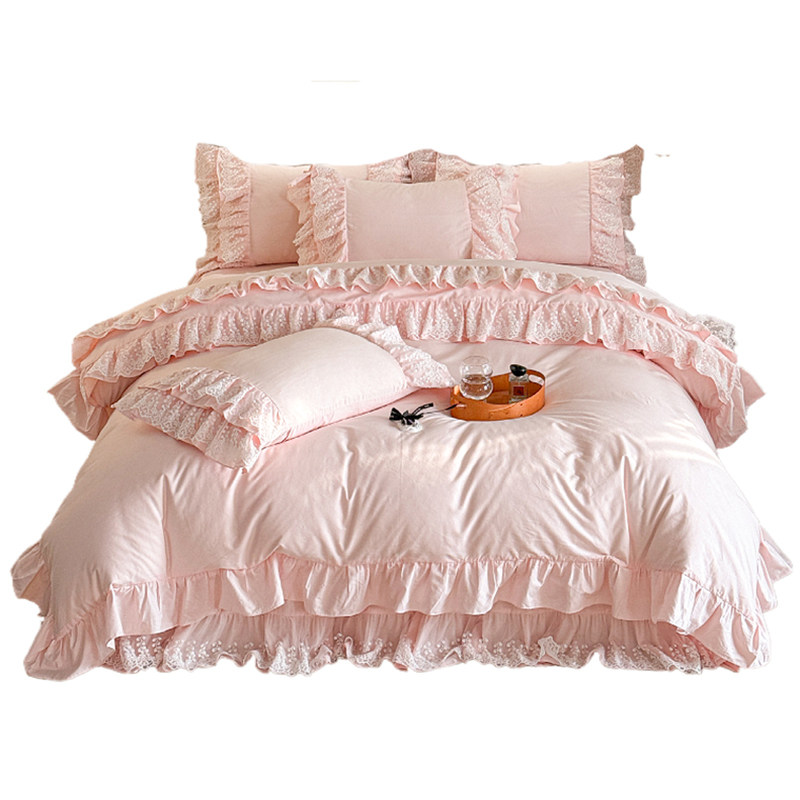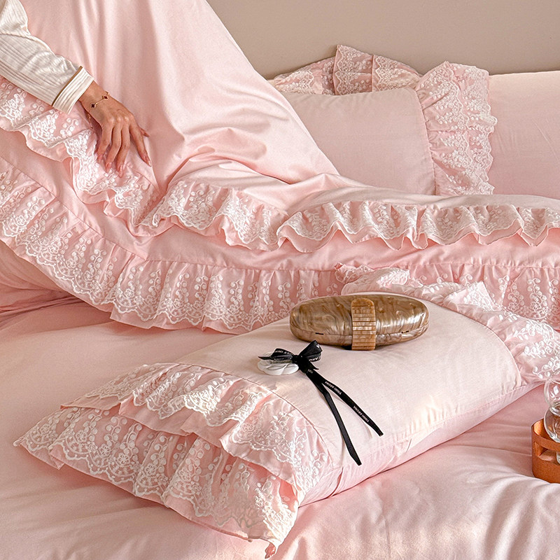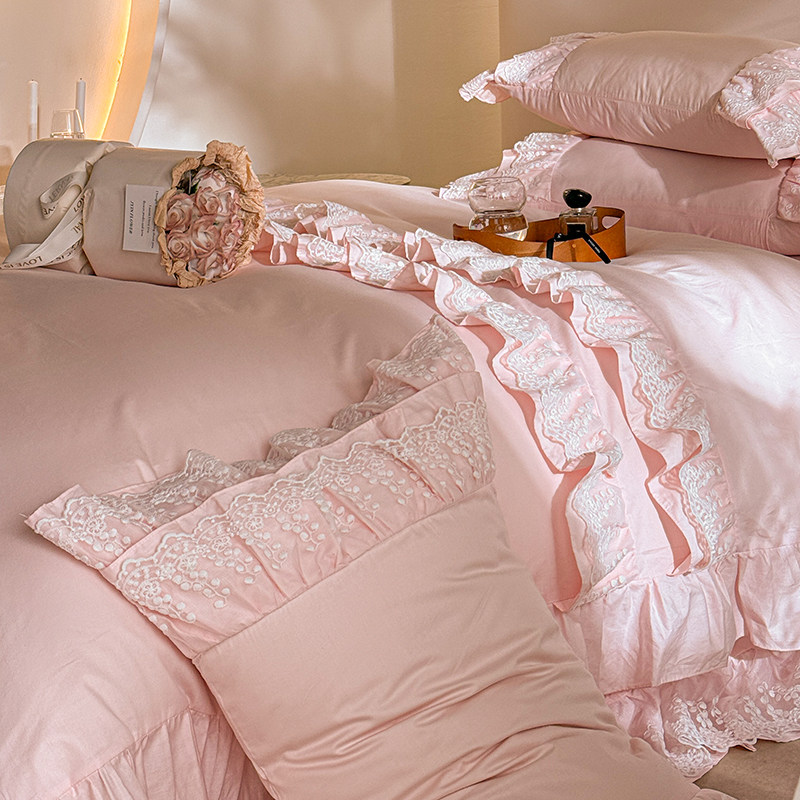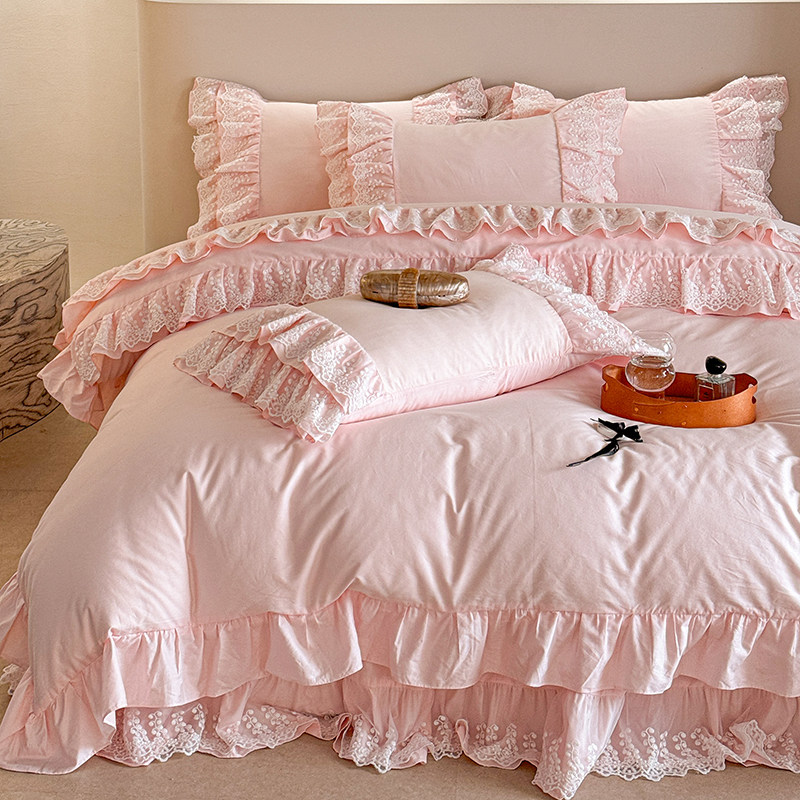 📚 法式全棉100纯棉粉色轻奢公主风四件套荷叶边被套蕾丝仙女床裙款4