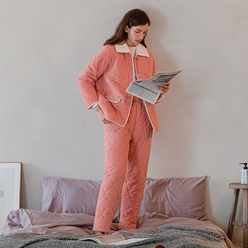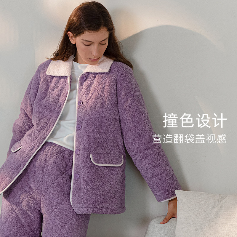 📚 秋鹿加绒保暖秋鹿加厚家居服女士冬季休闲开衫翻领夹棉睡衣女秋冬