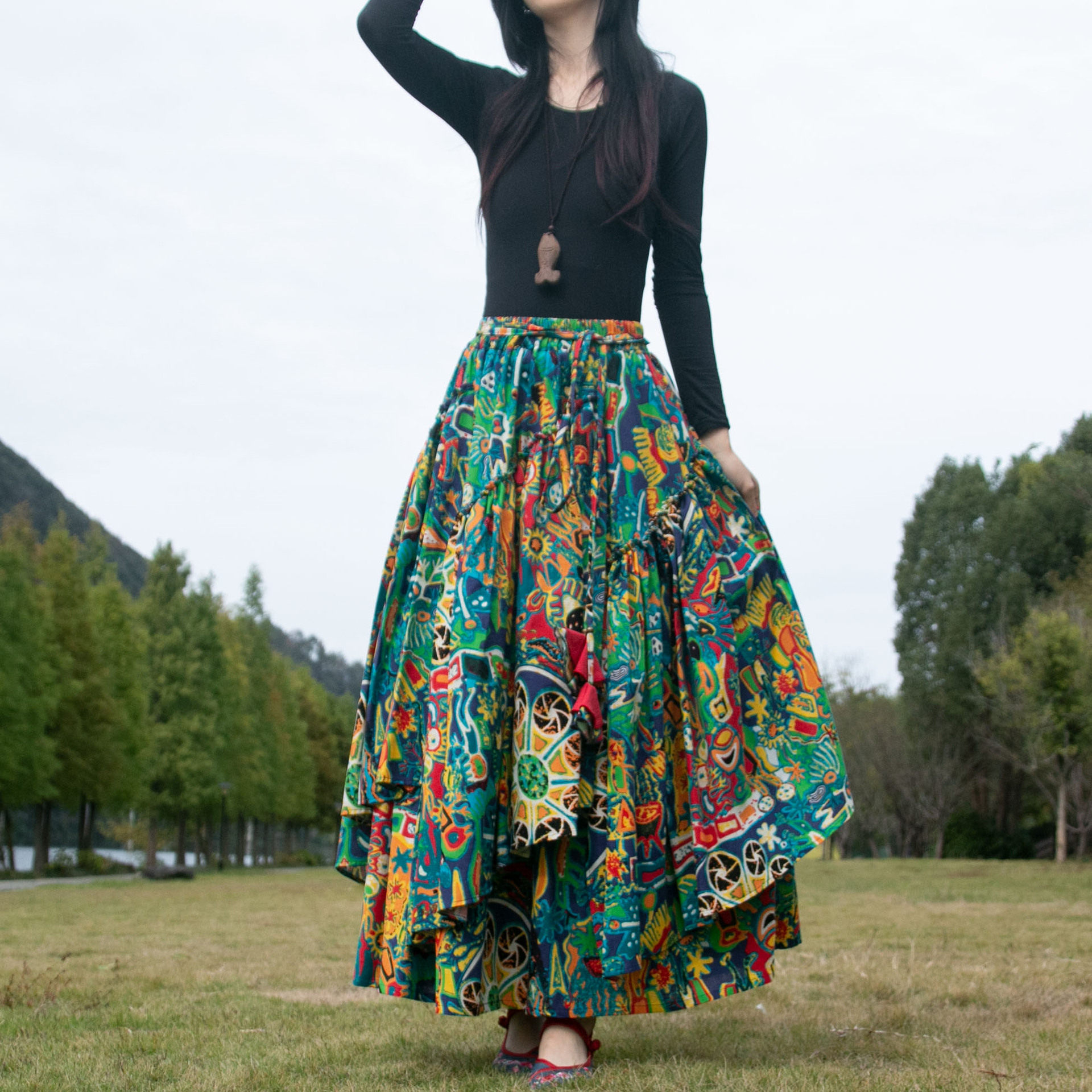 📚 2026民族风舞蹈长裙半身裙春秋冬小碎花棉麻不规则跳舞印花大摆裙
