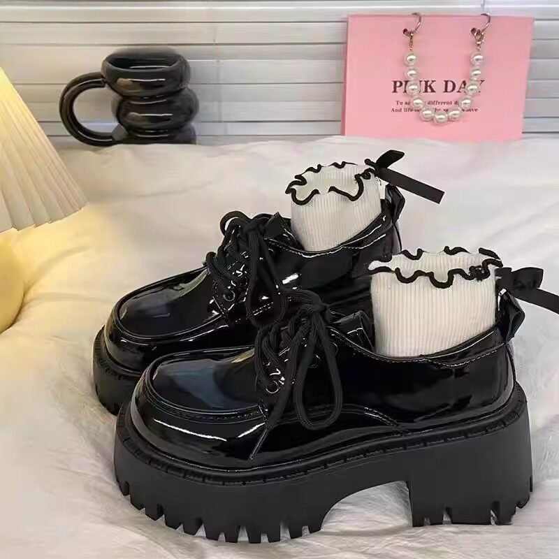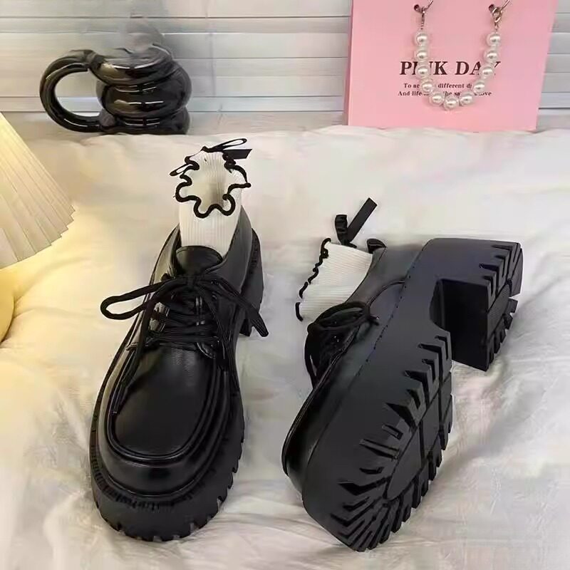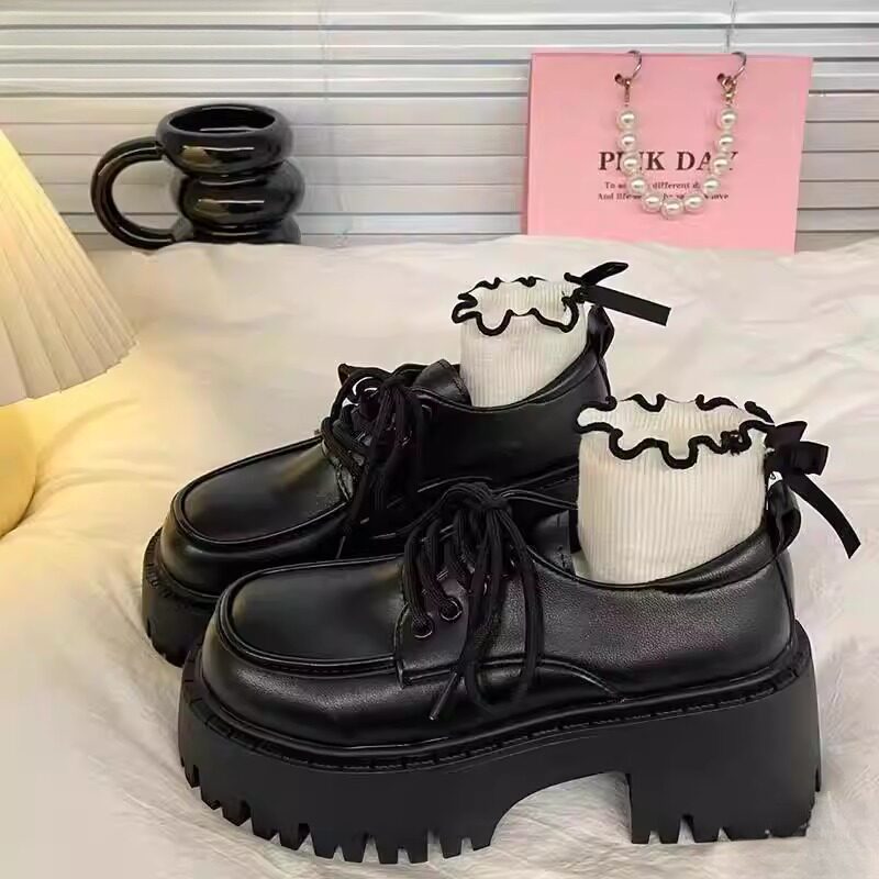 📚 厚底小皮鞋女英伦风2025春秋新款粗跟增高黑色乐福鞋系带复古单鞋
