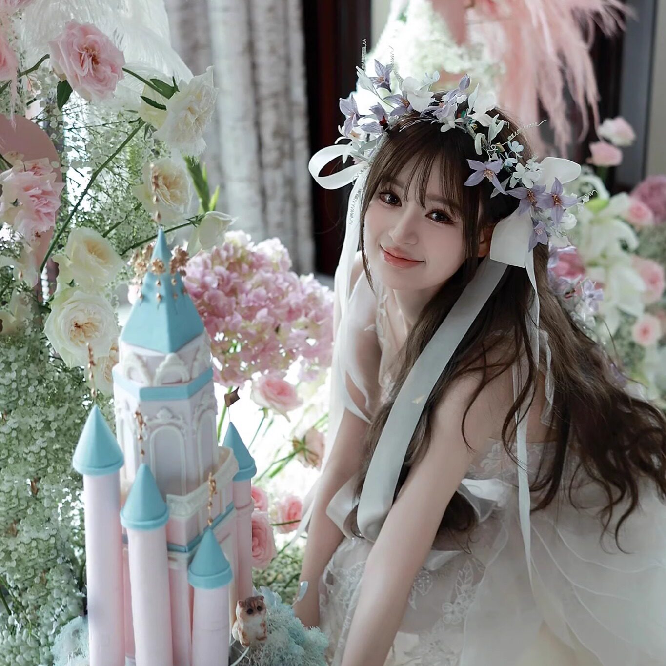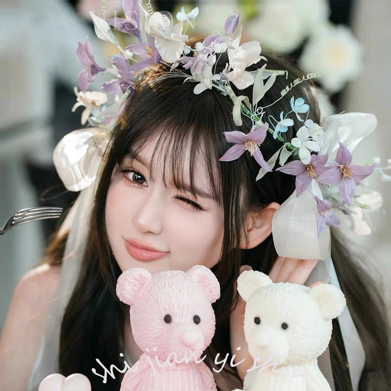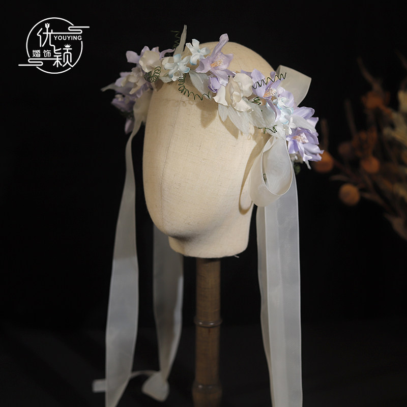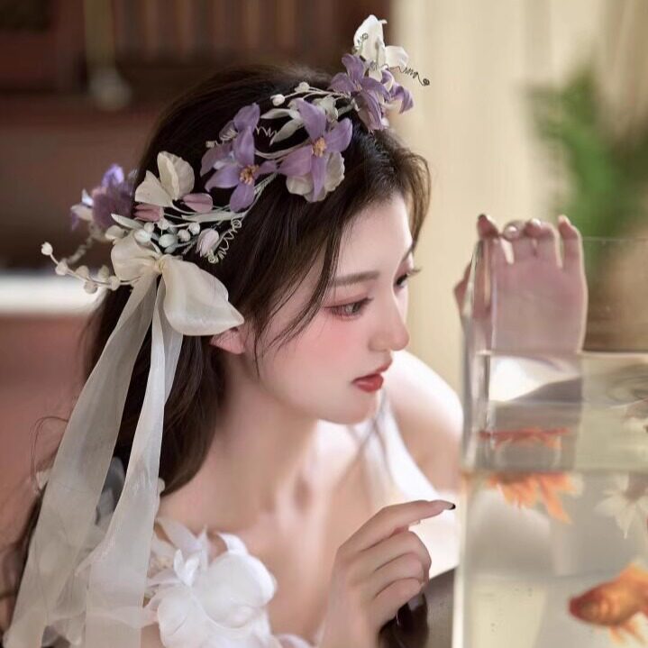 📚 森系新娘花环蝴蝶结飘带头饰紫色花朵发箍影楼写真旅拍演出发饰品