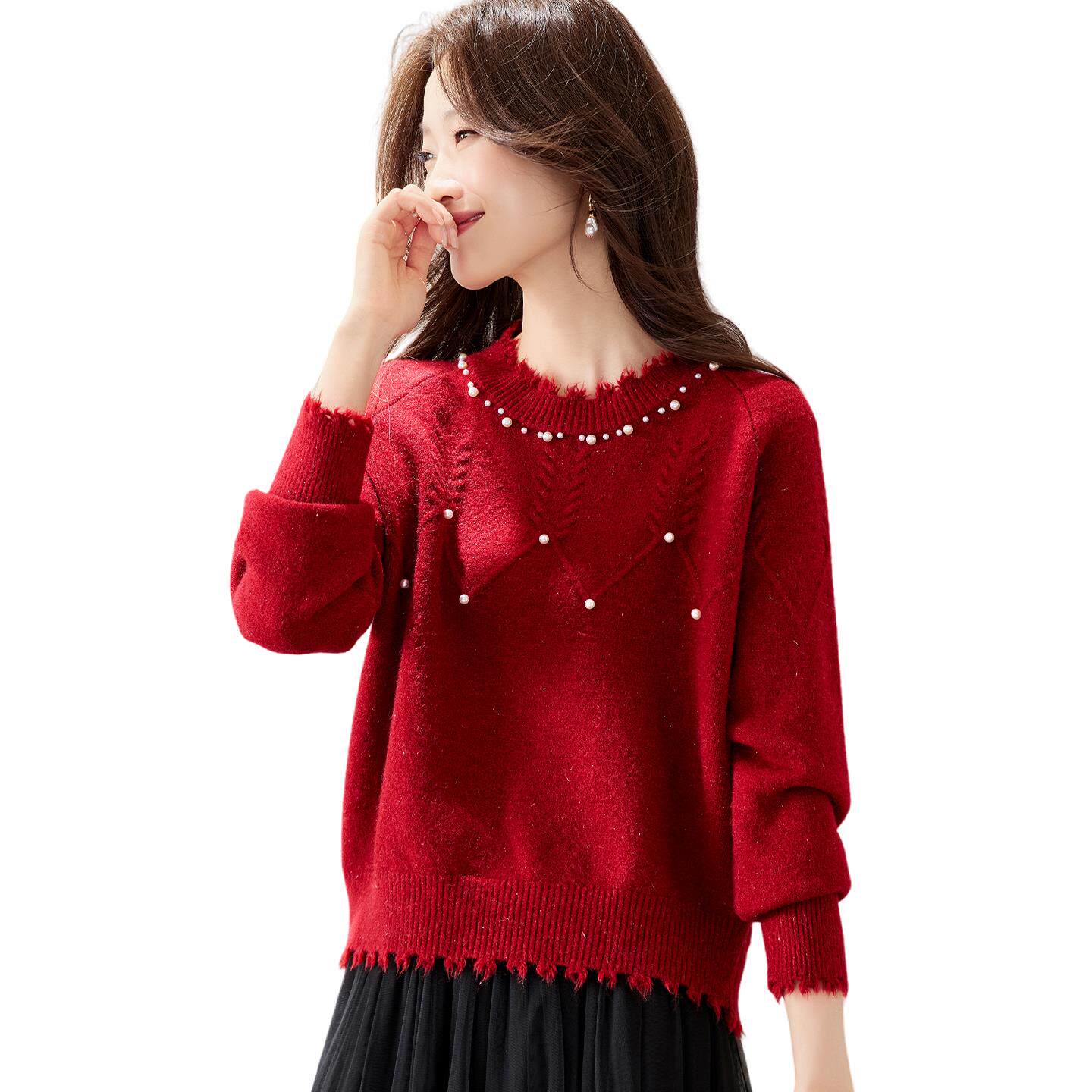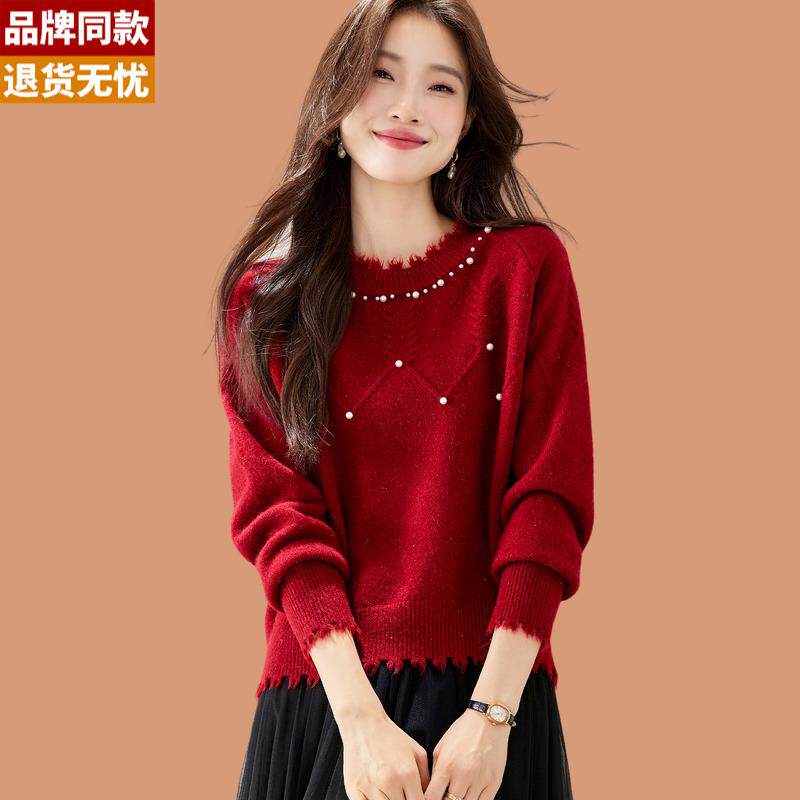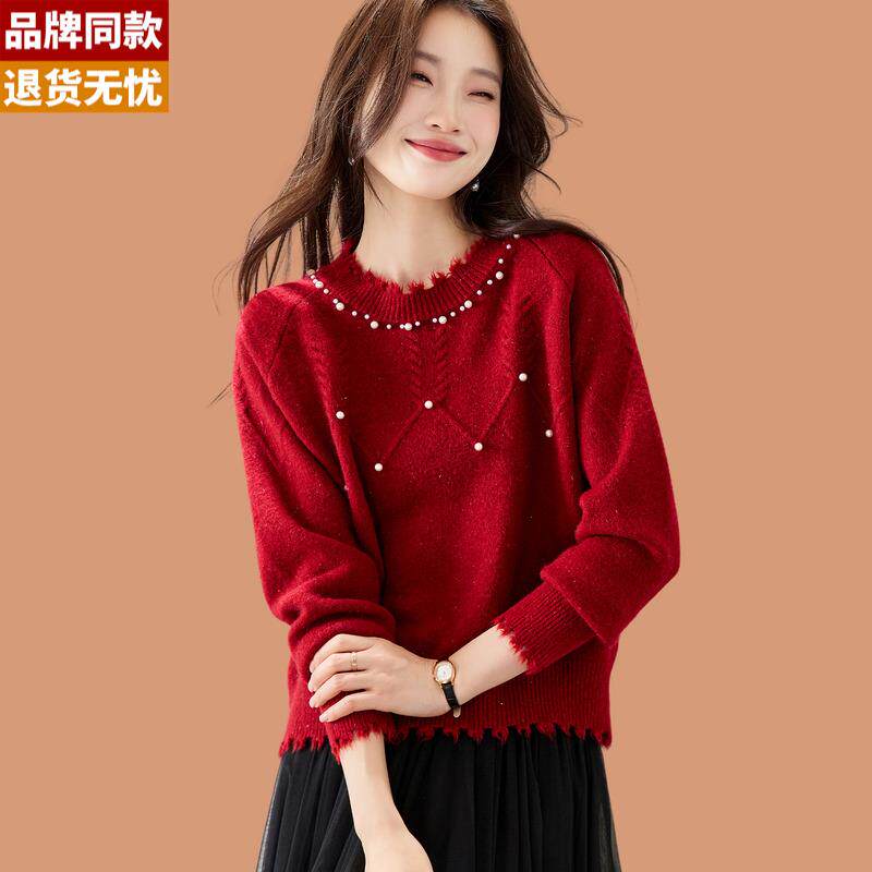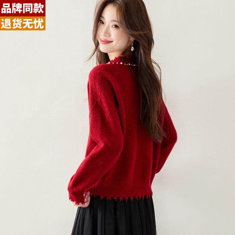 📚 氛围感红色钉珠毛衣女秋冬可外穿2025新款短款内搭羊毛针织打底衫