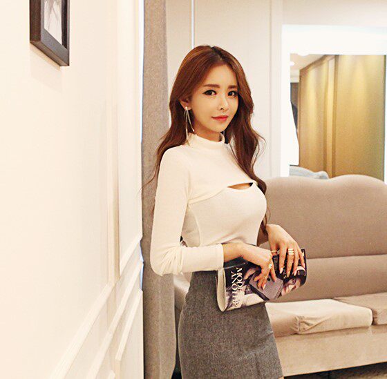 📚 秋季新款女上衣修身显瘦套头小衫性感镂空打底衫长袖内搭露胸T恤