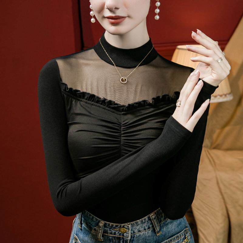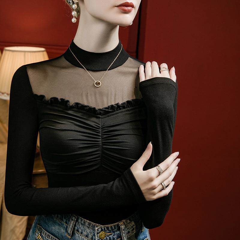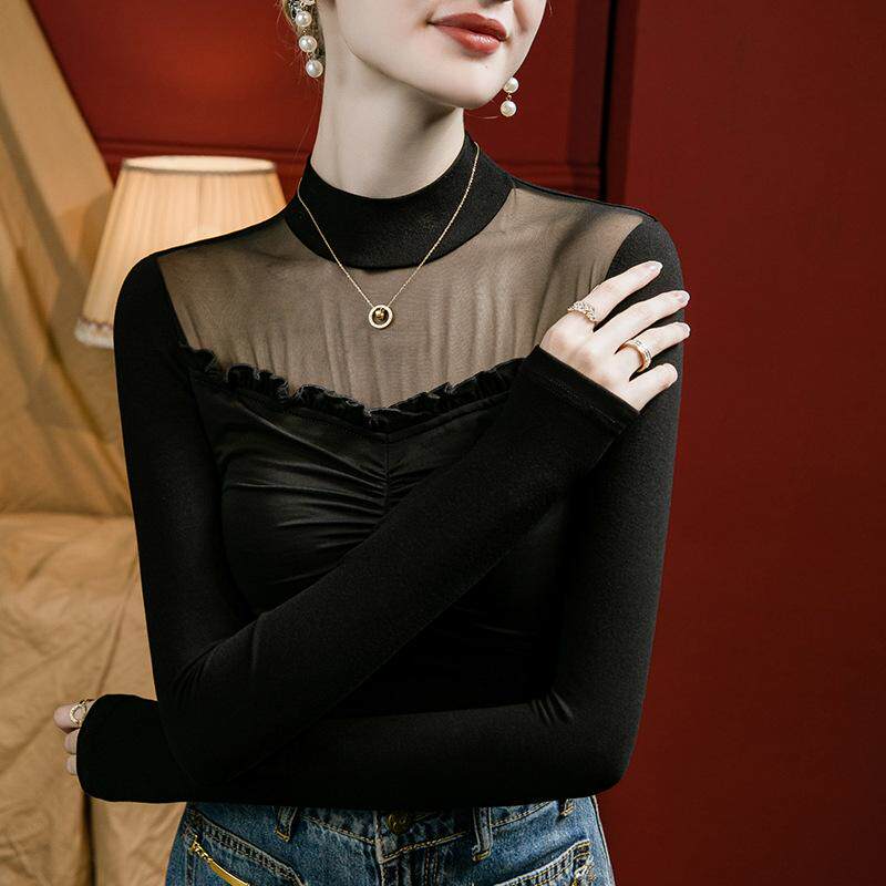 📚 2025年新款性感微透网纱拼接打底衫女长袖t恤半高领别致洋气上衣